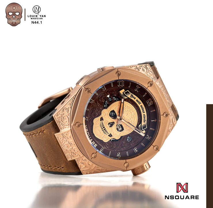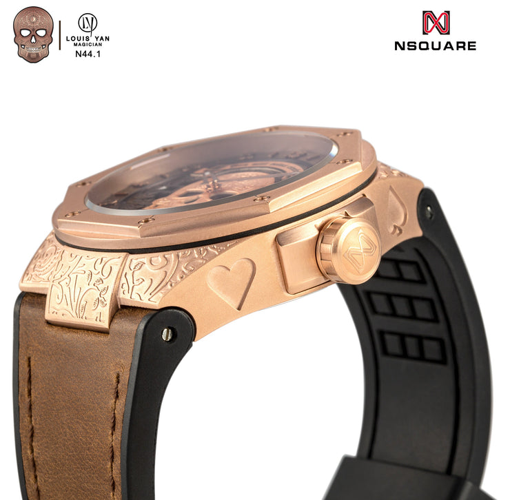 Louis believes in NSquare. By cooperating with special playing cards, The MAGICIAN contains 4 wonderful magic tricks which lets you become the focus of the party easily. The winning features of the collection are its super texture and weight, and this highlights his important position in the MAGICIAN world at the same time. You may see a mysterious pattern when you check the dial. The case is the focus and its diameter is 46mm. The strap and the watch's colour make it "cool" in one second.