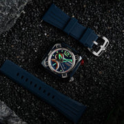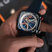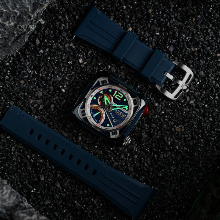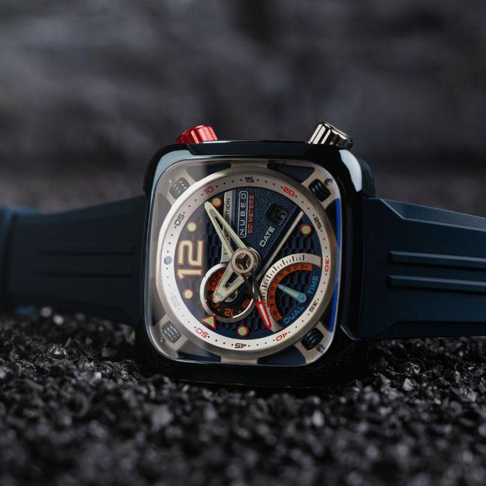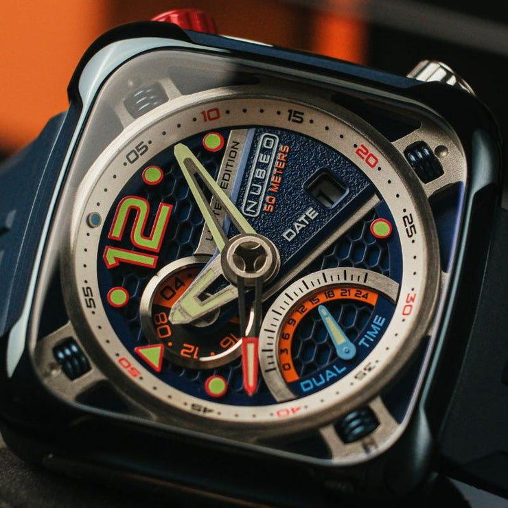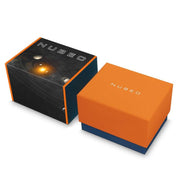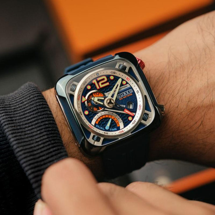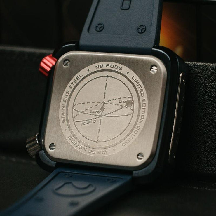 The ecliptic is the apparent path that the Sun follows in the sky as observed from the Earth. The Ecliptic Retrograde features a sleek, square stainless steel case. Inside it encloses a complex yet balanced architecture of dial and casework, evoking a futuristic and industrial aesthetic inspired by the engineered workings of spacecraft. Only 100 pieces are available per colourway.