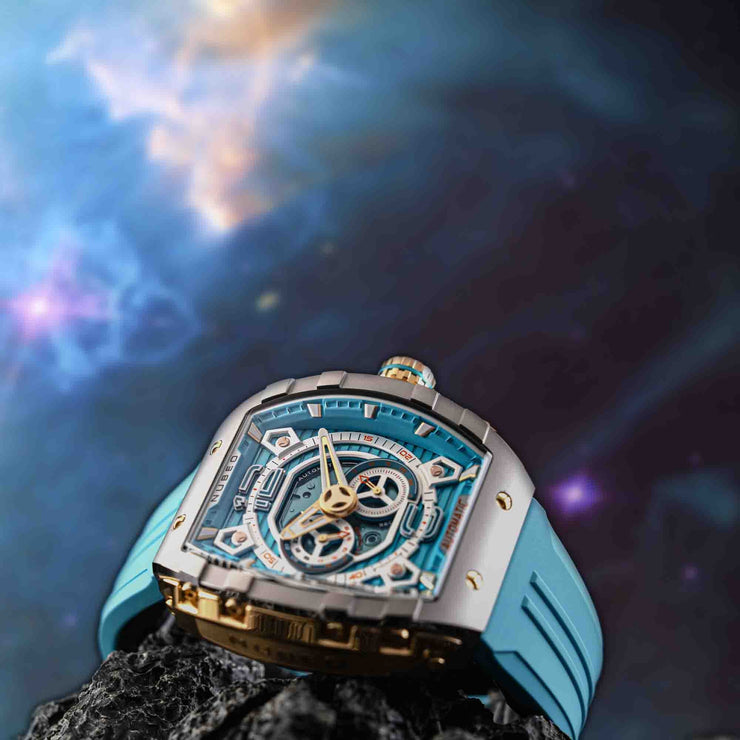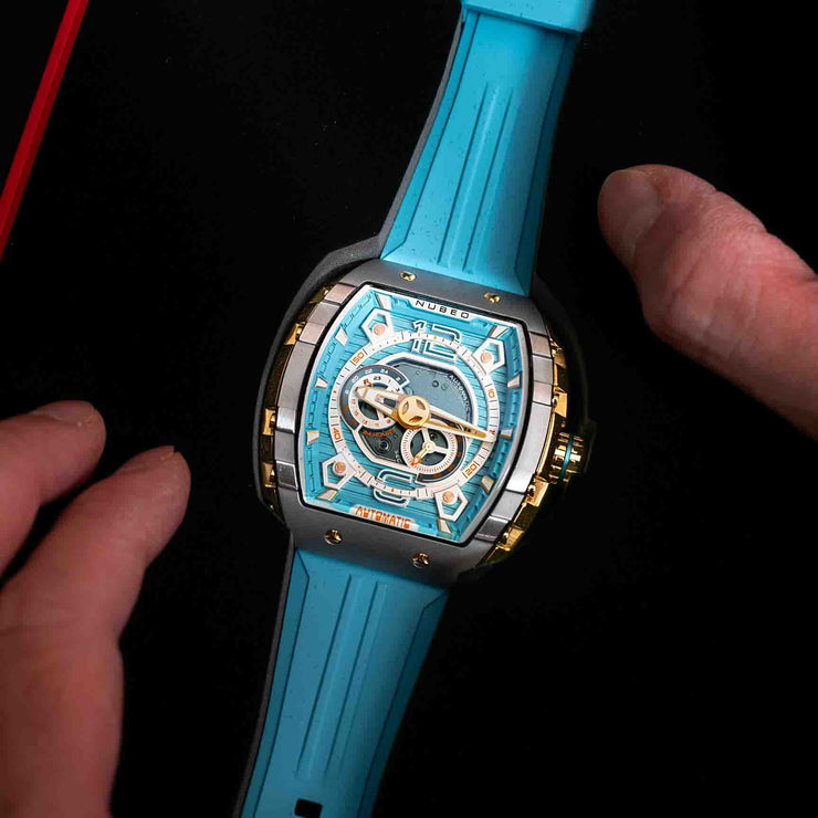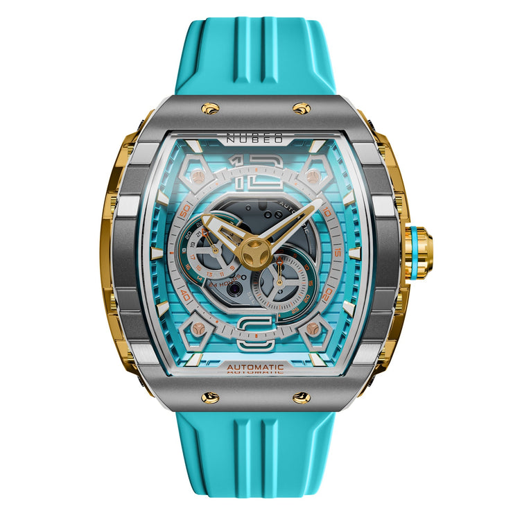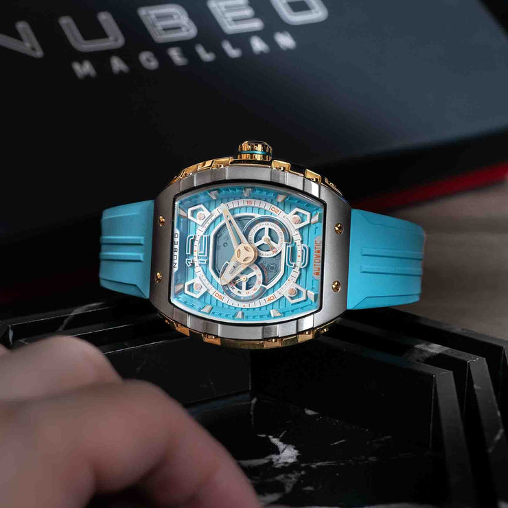 A new addition to Nubeo's beloved collection, Magellan 24 Hour Automatic features a signature tonneau-shaped case with interconnected parts, and a Japanese automatic movement with a 24-hour feature. This timepiece boasts both style and functionality. Available in bold and vibrant colors, it's a stunning and captivating addition to your watch collection.