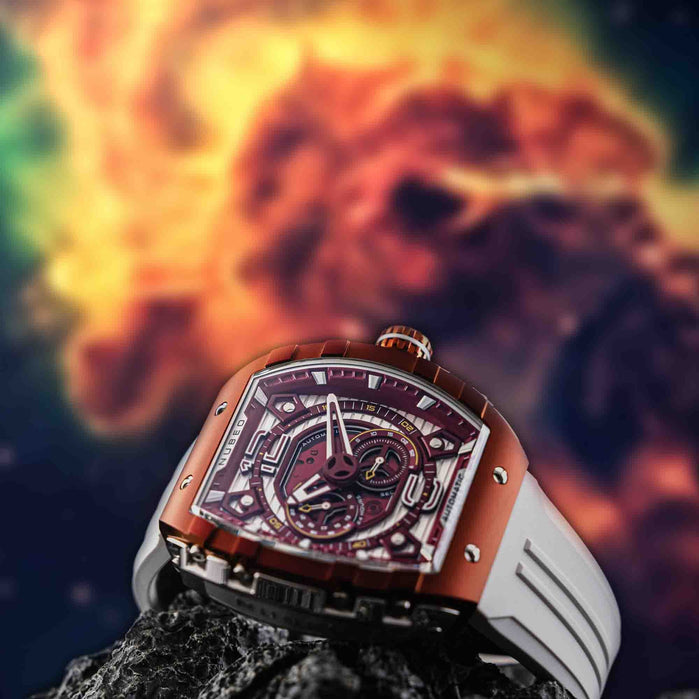 A new addition to Nubeo's beloved collection, Magellan 24 Hour Automatic features a signature tonneau-shaped case with interconnected parts, and a Japanese automatic movement with a 24-hour feature. This timepiece boasts both style and functionality. Available in bold and vibrant colors, it's a stunning and captivating addition to your watch collection.