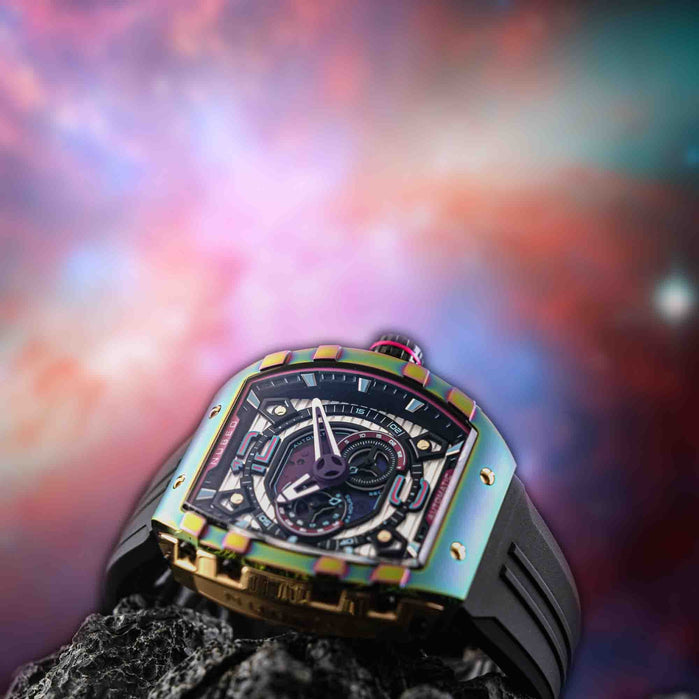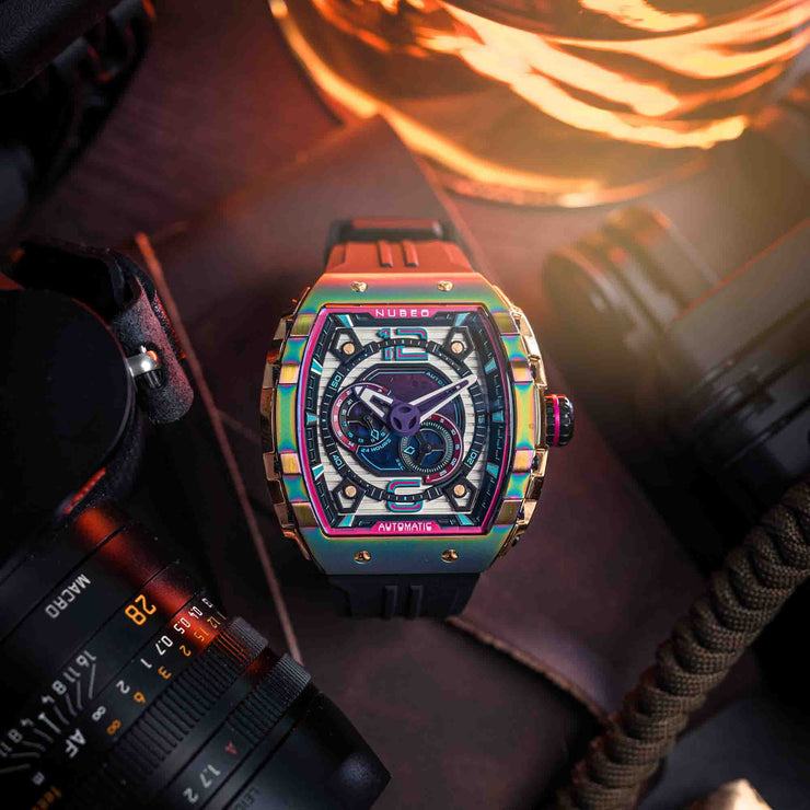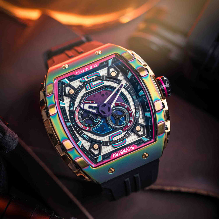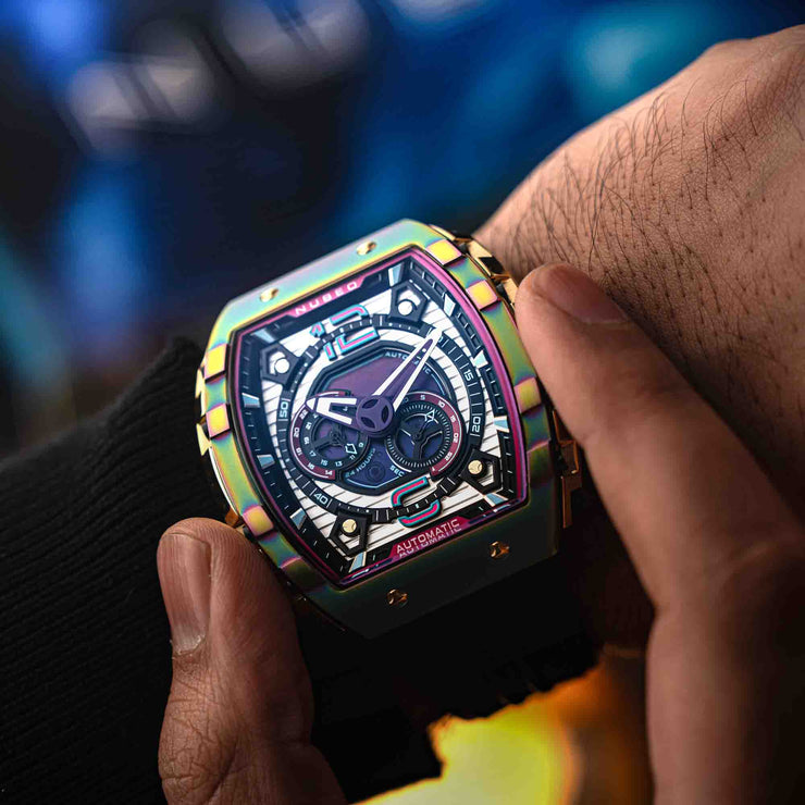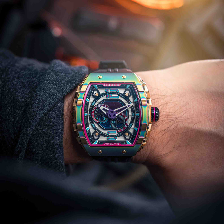A new addition to Nubeo's beloved collection, Magellan 24 Hour Automatic features a signature tonneau-shaped case with interconnected parts, and a Japanese automatic movement with a 24-hour feature. This timepiece boasts both style and functionality. Available in bold and vibrant colors, it's a stunning and captivating addition to your watch collection.