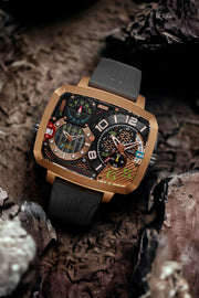 A spectacular timepiece at every angle. The Odyssey Triple Time Zone Chronograph is a limited edition of only 300 pieces. It features a unique space-inspired design and a dual time feature for travellers. Its rectangular case shape is also perfect for making a statement.
