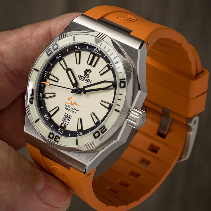 This limited-edition watch features an all-Sapphire unidirectional rotating bezel that bears hour-markers filled with seven layers of Swiss C3 Lume. Powerful C3 Lume on the key elements guarantees perfect readability when deep diving. Each timepiece includes both, an integrated bracelet, and a custom rubber strap. The movement inside the Bolt is a regulated Sellita SW200-1 movement. It has a beat rate of 28,800 vibrations per hour and has been enhanced for added accuracy.