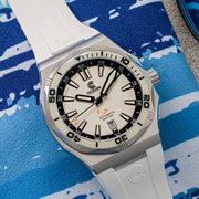 This limited-edition watch features an all-Sapphire unidirectional rotating bezel that bears hour-markers filled with seven layers of Swiss C3 Lume. Powerful C3 Lume on the key elements guarantees perfect readability when deep diving. Each timepiece includes both, an integrated bracelet, and a custom rubber strap. The movement inside the Bolt is a regulated Sellita SW200-1 movement. It has a beat rate of 28,800 vibrations per hour and has been enhanced for added accuracy.