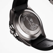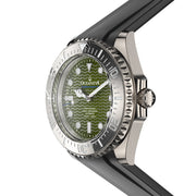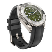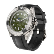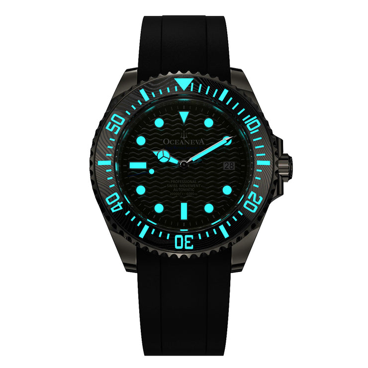 The case is constructed from Grade 5 titanium, which is over twice as strong and hard as stainless steel while remaining 40% lighter, offering superior durability and comfort. Powered by the Swiss-made SW200 automatic movement with 26 jewels and a 38-hour power reserve, the watch delivers exceptional precision and reliability. A unidirectional bezel forged from Damascus-patterned 304 and 316L stainless steel adds visual depth and is enhanced with Grade A Swiss Super-LumiNova for high visibility in dark environments. The gradient wave-pattern dial evokes the spirit of the ocean, complemented by luminous stainless steel hands and a blue-tipped sweeping seconds hand. A 6mm slightly domed sapphire crystal ensures clarity and scratch resistance, while a helium escape valve provides essential protection for saturation diving. Completing the watch is a high-grade German FKM rubber strap with a polished titanium buckle secured by a screw-in mechanism—offering both style and confidence for any adventure.