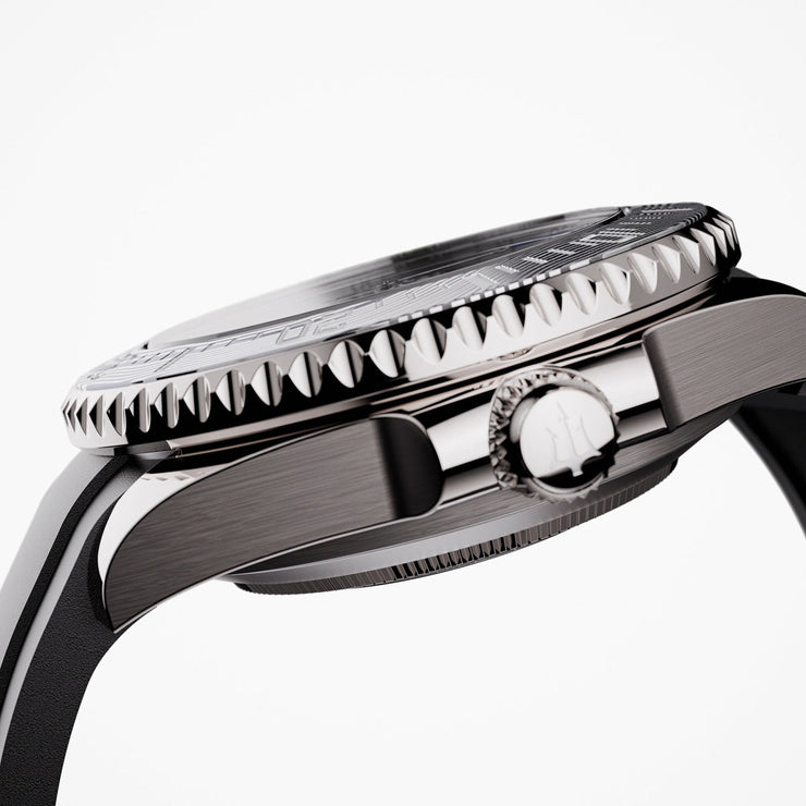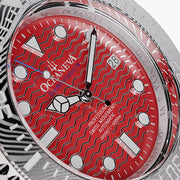 The case is constructed from Grade 5 titanium, which is over twice as strong and hard as stainless steel while remaining 40% lighter, offering superior durability and comfort. Powered by the Swiss-made SW200 automatic movement with 26 jewels and a 38-hour power reserve, the watch delivers exceptional precision and reliability. A unidirectional bezel forged from Damascus-patterned 304 and 316L stainless steel adds visual depth and is enhanced with Grade A Swiss Super-LumiNova for high visibility in dark environments. The gradient wave-pattern dial evokes the spirit of the ocean, complemented by luminous stainless steel hands and a blue-tipped sweeping seconds hand. A 6mm slightly domed sapphire crystal ensures clarity and scratch resistance, while a helium escape valve provides essential protection for saturation diving. Completing the watch is a high-grade German FKM rubber strap with a polished titanium buckle secured by a screw-in mechanism—offering both style and confidence for any adventure.