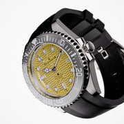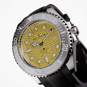 The case is constructed from Grade 5 titanium, which is over twice as strong and hard as stainless steel while remaining 40% lighter, offering superior durability and comfort. Powered by the Swiss-made SW200 automatic movement with 26 jewels and a 38-hour power reserve, the watch delivers exceptional precision and reliability. A unidirectional bezel forged from Damascus-patterned 304 and 316L stainless steel adds visual depth and is enhanced with Grade A Swiss Super-LumiNova for high visibility in dark environments. The gradient wave-pattern dial evokes the spirit of the ocean, complemented by luminous stainless steel hands and a blue-tipped sweeping seconds hand. A 6mm slightly domed sapphire crystal ensures clarity and scratch resistance, while a helium escape valve provides essential protection for saturation diving. Completing the watch is a high-grade German FKM rubber strap with a polished titanium buckle secured by a screw-in mechanism—offering both style and confidence for any adventure.
