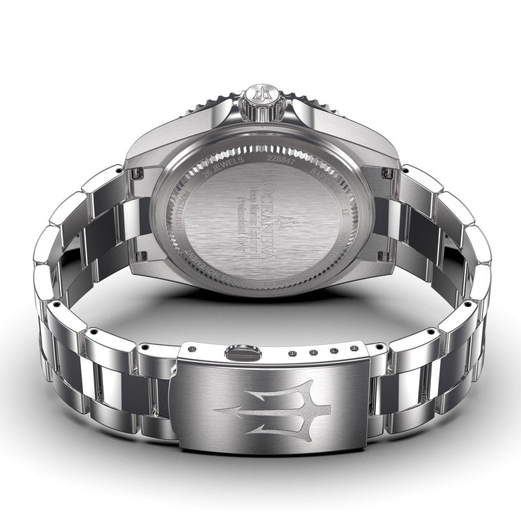 Clasp: Push-button milled clasp with Oceaneva trident logo and micro-adjustments.