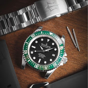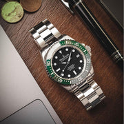 Bezel: Green ceramic, uni-directional rotating 120 click, ultra-scratch resistant.