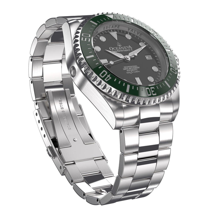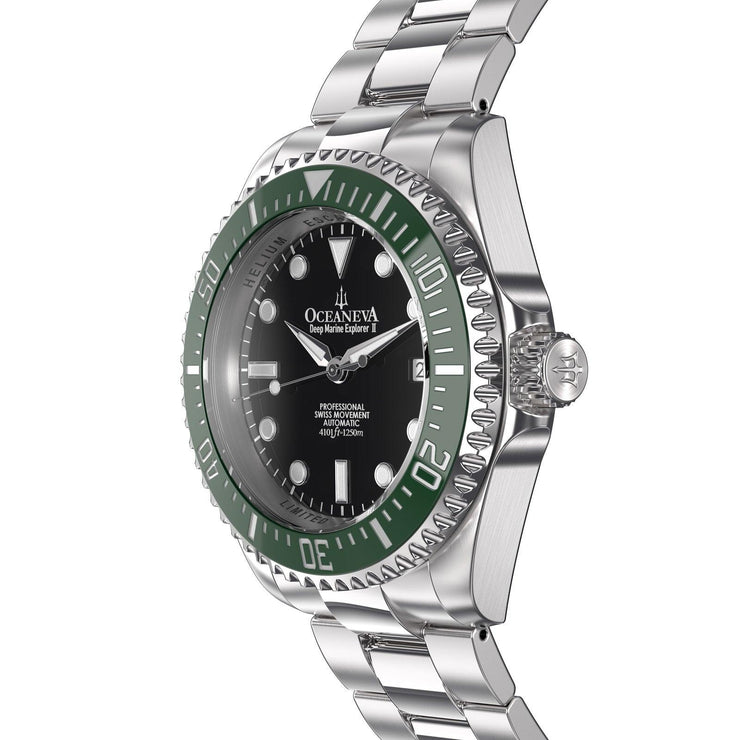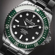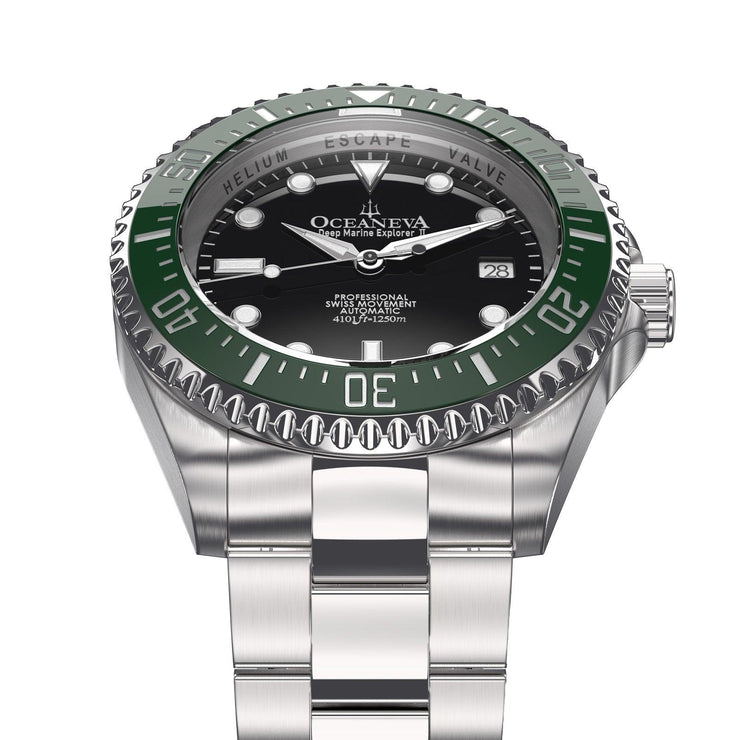 Introducing the epitome of precision, durability, and sheer elegance—the Oceaneva™ Men's Deep Marine Explorer II 1250M Pro Diver Watch Black and Green. This timepiece isn't just a watch; it's a testament to the adventures you've yet to undertake, the successes you're destined to achieve, and the stories you're eager to tell. Targeted at luxury watch collectors, adventure enthusiasts, and affluent professionals, the Oceaneva™ Men's Deep Marine Explorer II embodies elite sophistication. Its handcrafted precision and elegance set trends and signify wealth, marking you as a trendsetter among peers. Proudly standing as the only USA brand to ocean-test their watches since 1960, Oceaneva demonstrates an unwavering commitment to quality and performance. This dedication resonates with our customers, as evidenced by glowing testimonials highlighting the superior workmanship, timely shipping, and exceptional customer service that come with every Oceaneva watch.