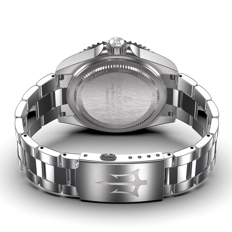 Clasp: Push-button milled clasp with Oceaneva trident logo and micro-adjustments.