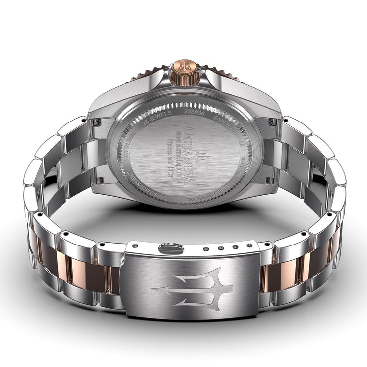 Clasp: Push-button milled clasp with Oceaneva trident logo and micro-adjustments.