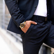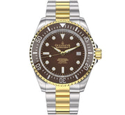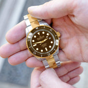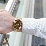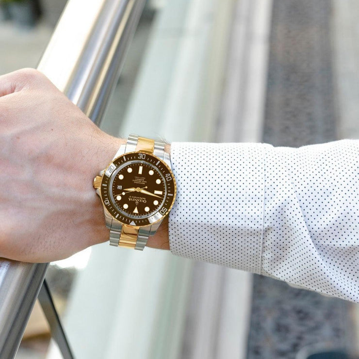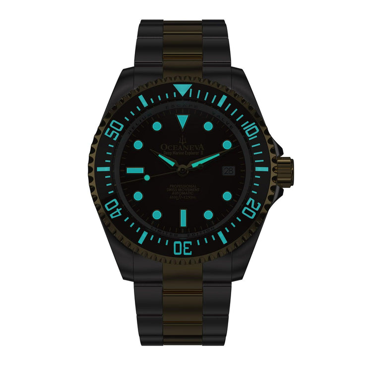 Illuminated by BWG9 Swiss Super Luminova across its hands, hour markers, and bezel, this watch ensures clarity and visibility in the darkest conditions. It's not just a tool for timekeeping; it's a companion for every adventure. Encased in 316L surgical stainless steel and adorned with a brown ceramic uni-directional rotating bezel, the Deep Marine Explorer II is a masterpiece of design. Its bracelet, a fusion of brushed finish and polished center links in yellow gold IP, is testament to a grade A fit and finish, reflecting the pinnacle of luxury. Double ip plated for decades of reliability.