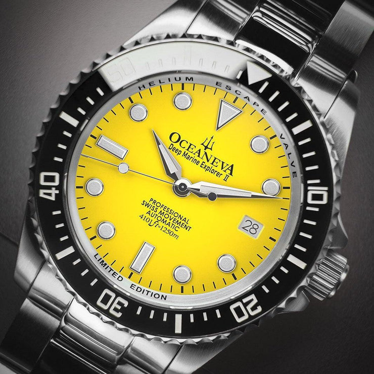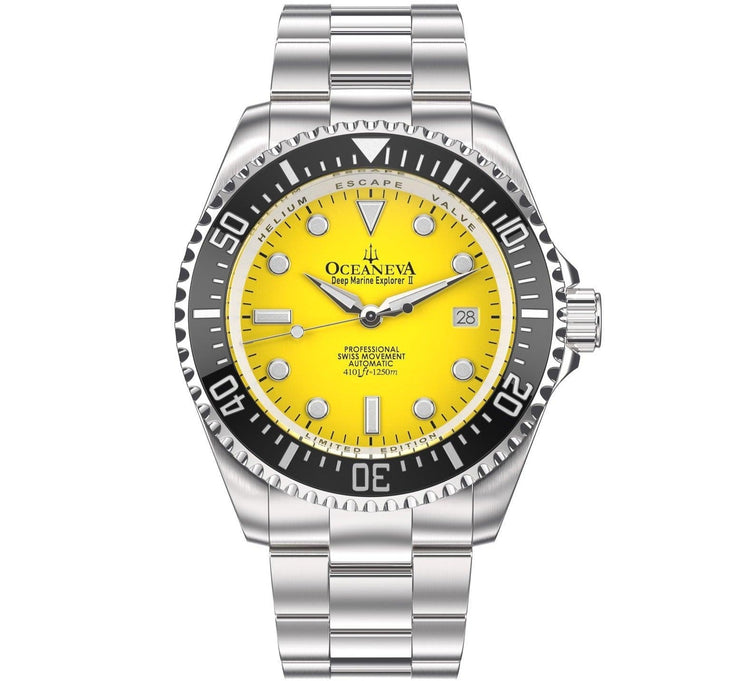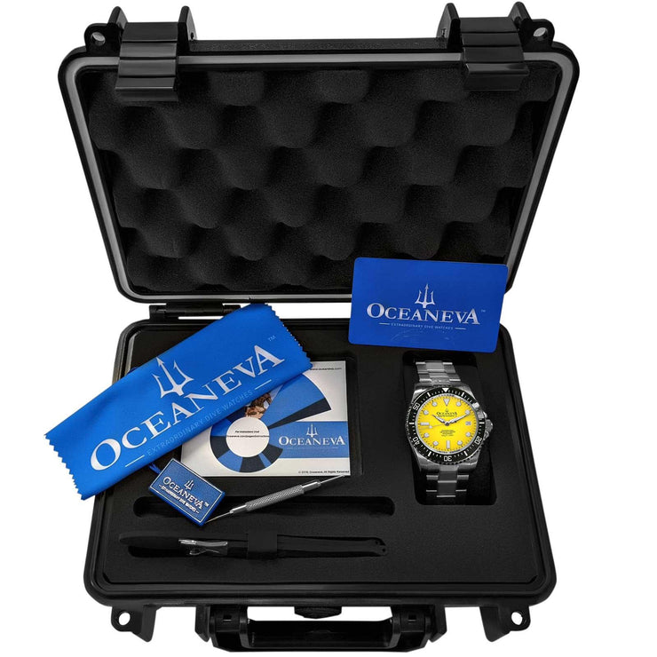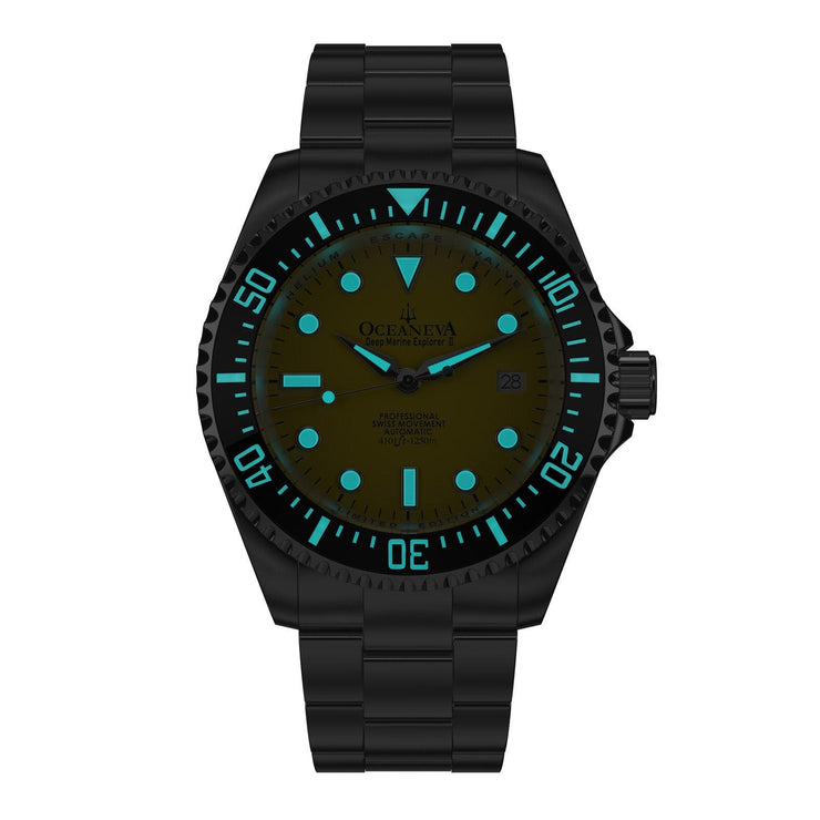 Oceaneva stands apart as the only USA brand and the sixth worldwide since 1960 to ocean test their watches, affirming our commitment to quality, performance, and customer satisfaction. The Oceaneva™ Men's Deep Marine Explorer II is more than a watch; it's a legacy. With its helium escape valve, ceramic bezel full of luminosity, and a design tested by water pressure to 1250M, this timepiece is built for the discerning individual who values precision, adventure, and style.