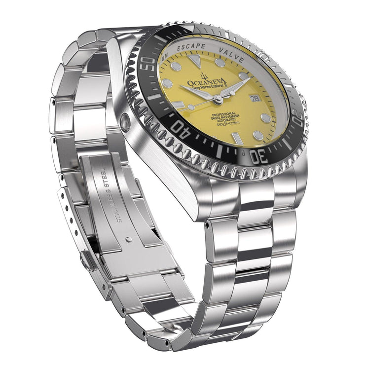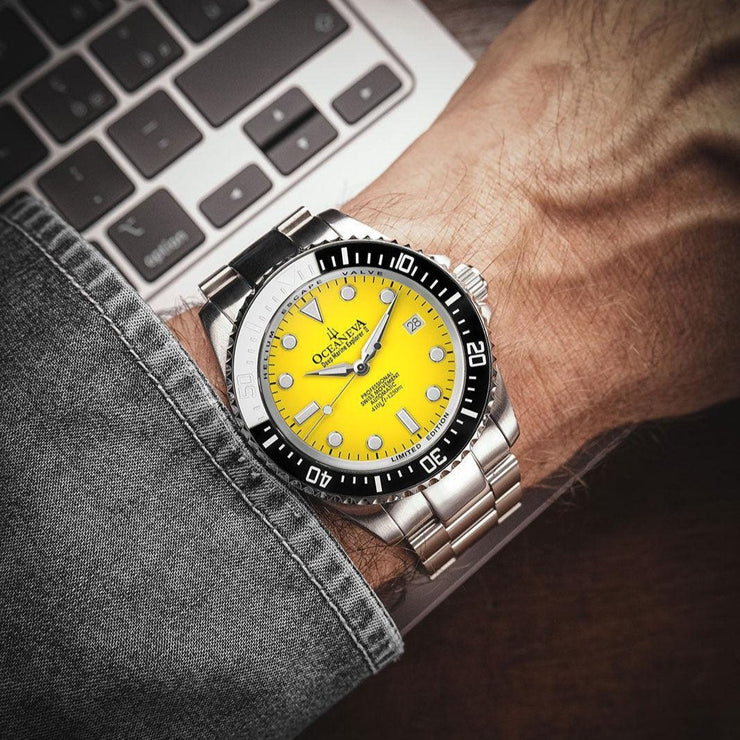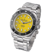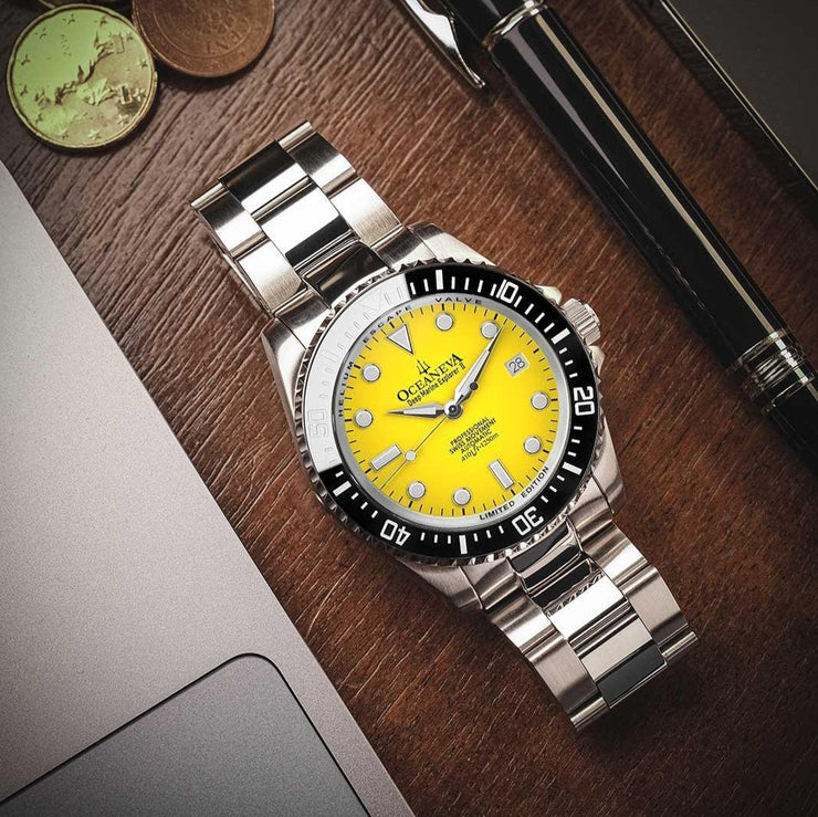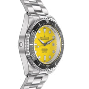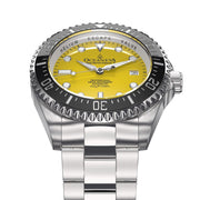 Experience the pinnacle of watch engineering with a movement that promises unmatched accuracy and reliability. Ocean-tested design that ensures your watch can withstand the pressures of deep-sea exploration, making it the perfect companion for your adventures. With only 1000 pieces produced, owning this watch places you in an elite group of collectors worldwide. Featuring BWG9 Swiss Super Luminova on hands, hour markers, and the bezel, for clear visibility in the deepest of waters or the darkest of nights. Crafted from 316L surgical stainless steel and a black ceramic bezel, this watch is designed for both durability and style. A striking yellow dial set within a case of brushed and polished steel, complemented by a solid link stainless steel bracelet with polished center links.