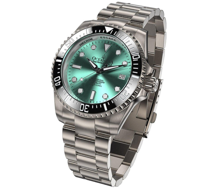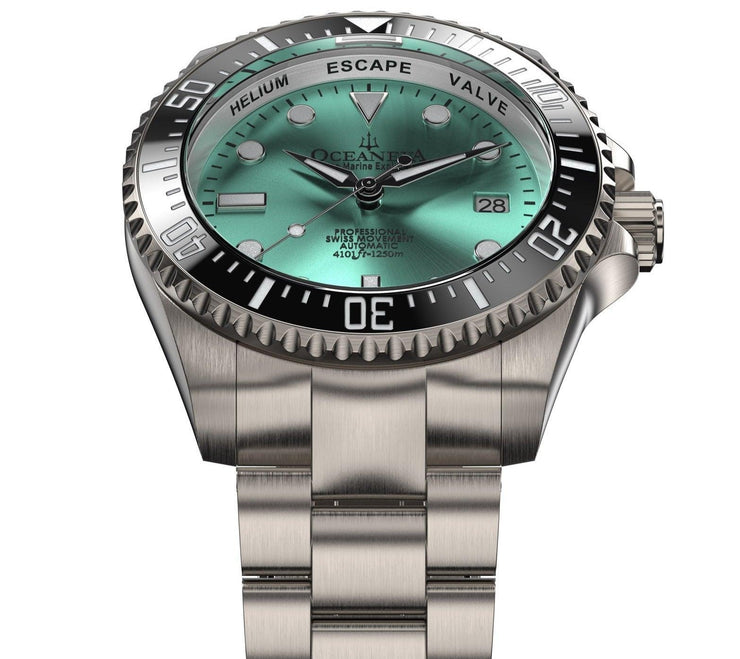 With only 1000 pieces produced, this limited edition watch represents a unique blend of exclusivity and premium Swiss craftsmanship with its Swiss Made Automatic Movement. Encased in solid titanium and adorned with an Aquamarine Burst Dial, this masterpiece redefines durability and elegance. Its nearly scratchproof anti-reflective domed sapphire crystal and black ceramic unidirectional rotating bezel are designed for those who thrive in the depths of life's challenges and the heights of its successes.