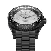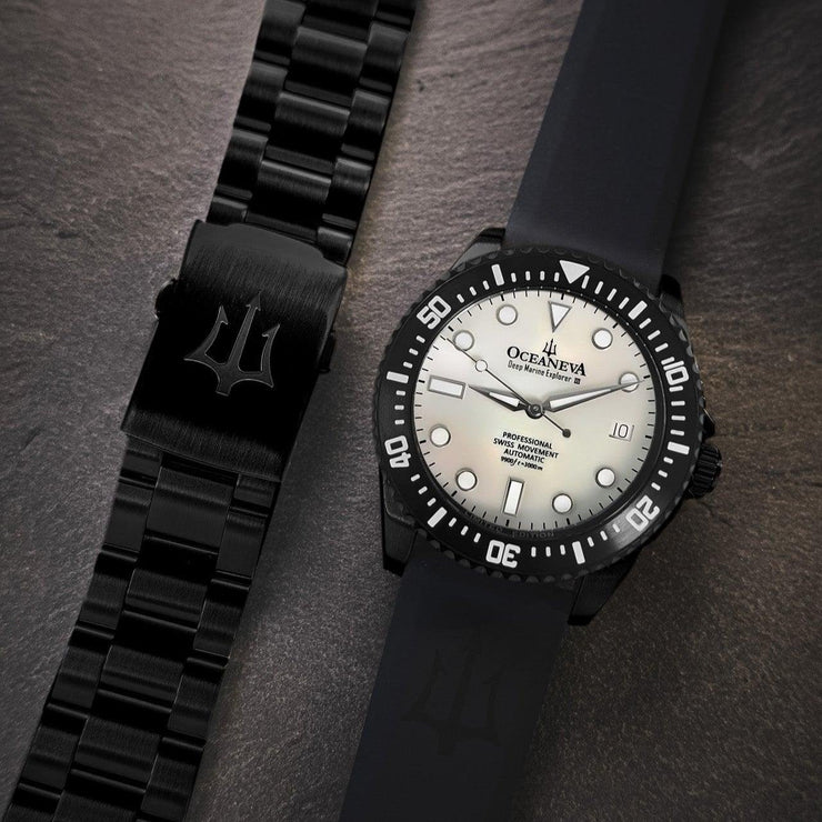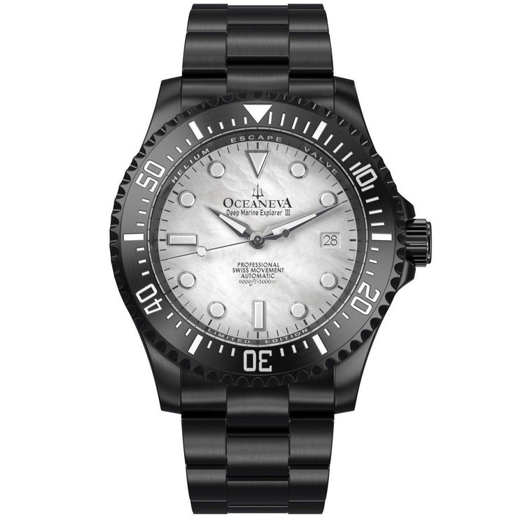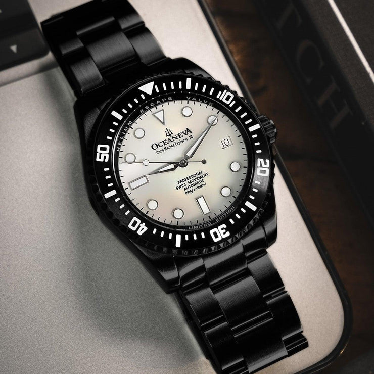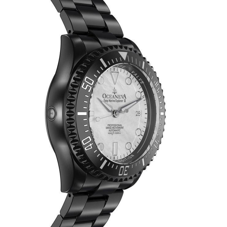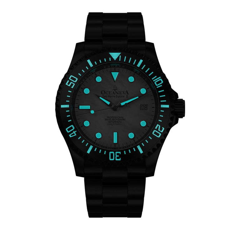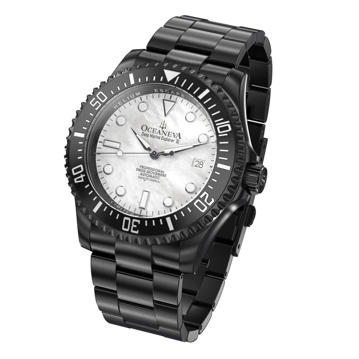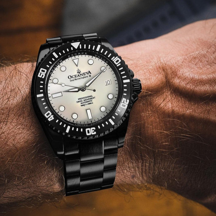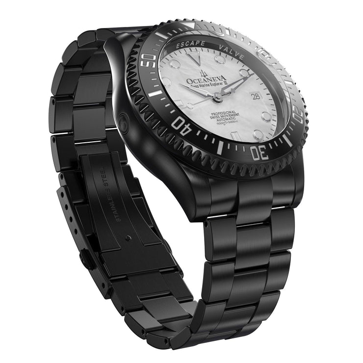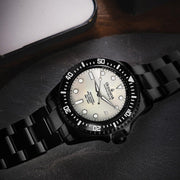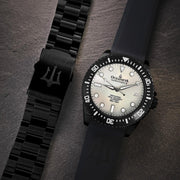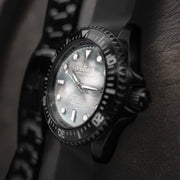 Powered by the Swiss Made Sellita SW200-1 Automatic movement, ensuring precision on par with legendary explorers. Designed to conquer depths up to 3000M, this watch has braved the ocean’s abyss on ROVs, promising reliability where most watches dare not venture. The dial and bezel glow with top-grade BGW9 Swiss Super Luminova, guaranteeing clarity in the darkest underwaters. 316L Surgical Stainless Steel with Black IP plating, a process shared with the finest Swiss brands, double plated for decades of durability showcases a commitment to durability and elegance. Premium white Pacific Oyster shell dial. A White Mother of Pearl Dial made of premium pacific oyster shell sets a stage for distinction, matched only by the watch’s limited production—making each piece a rare treasure.