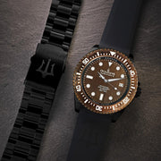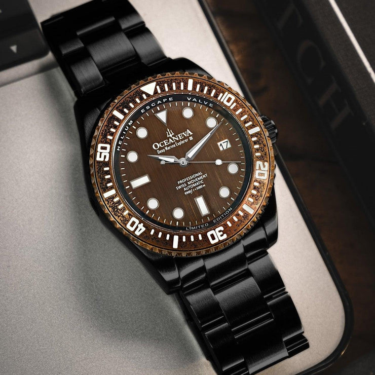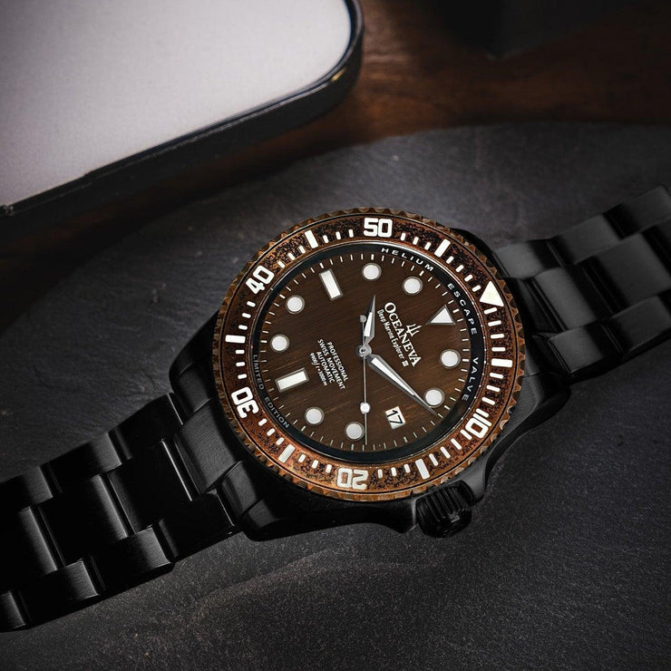 Boasting the Swiss-made Sellita SW200-1 Automatic movement, renowned for its accuracy, durability, and a testament to a 250-year venerated crafting tradition. With a 3000m water resistance rating, this watch stands as a beacon of endurance, tested in the deep ocean to prove it doesn't just meet but exceeds the highest standards of durability and resilience. Adorned with the premier BGW9 Swiss Super Luminova, ensuring outstanding legibility under the darkest depths. Each engraved marker sparks to life in low-light conditions, guiding you through the abyss. A meticulous handcrafted marvel featuring a 316L stainless steel case, aged bronze dial, and virtually scratchproof domed sapphire crystal, harmonizing elegance with rugged functionality. Black ip double plated for decades of reliability. Limited to just 1000 pieces worldwide, each with its unique serial number, offering exclusivity to the discerning collector and enthusiast.