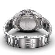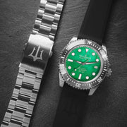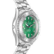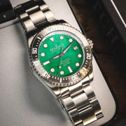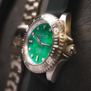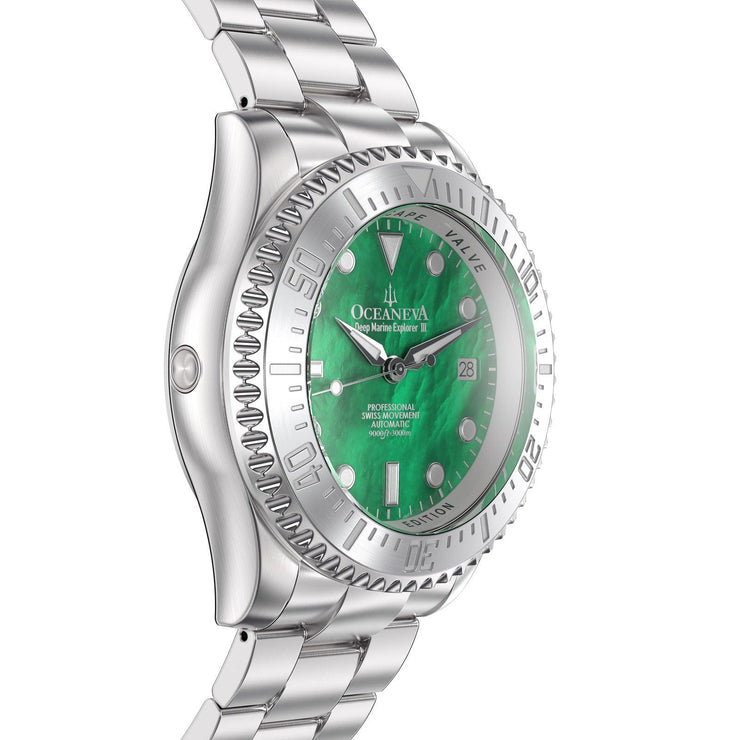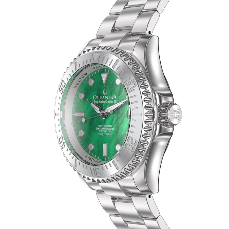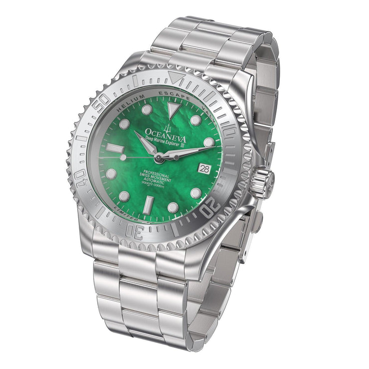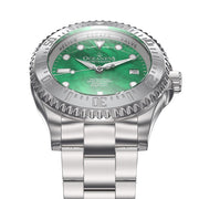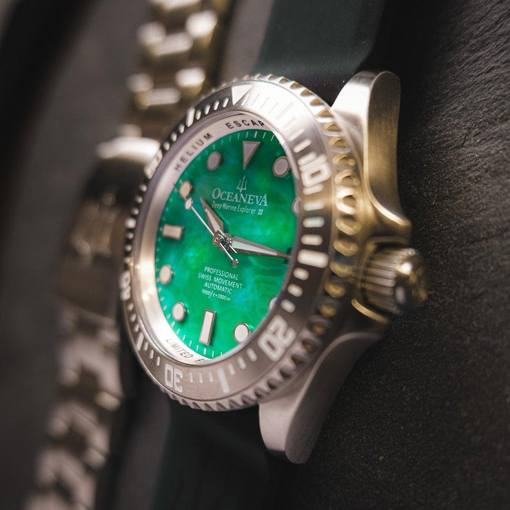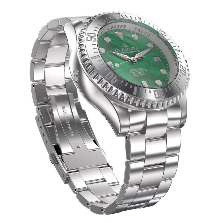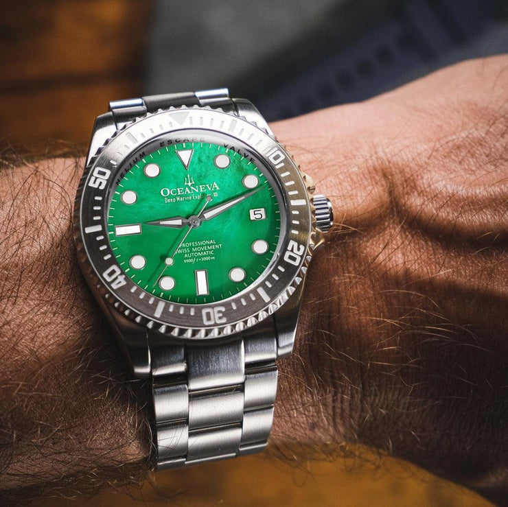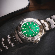 The BGW9 Swiss Super Luminova graces the hands, hour markers, and all markers on the bezel, ensuring unparalleled visibility in the darkest depths. This top-grade, long-lasting luminous material brings the Green Mother of Pearl Dial to life, made from premium pacific oyster shell captivating onlookers and lighting up your path to success. Constructed from 316L Surgical Stainless Steel and shielded by a nearly scratchproof Anti-Reflective Domed Sapphire crystal, this watch embodies resilience. The steel, uni-directional rotating, ultra-scratch-resistant bezel further accentuates its robust charm, prepared to face any challenge, anywhere. Stand out from the crowd with one of only 1000 pieces available worldwide.