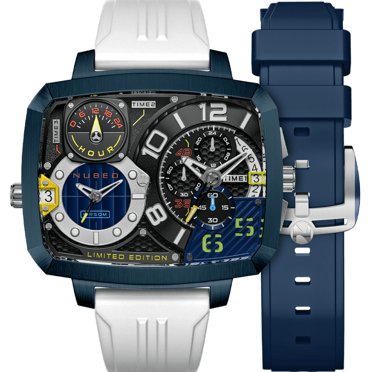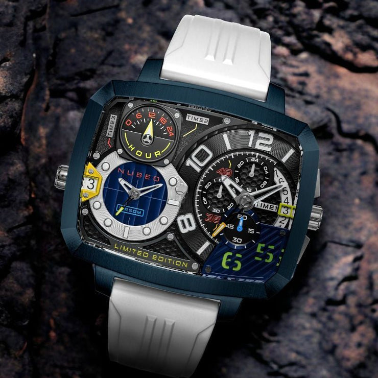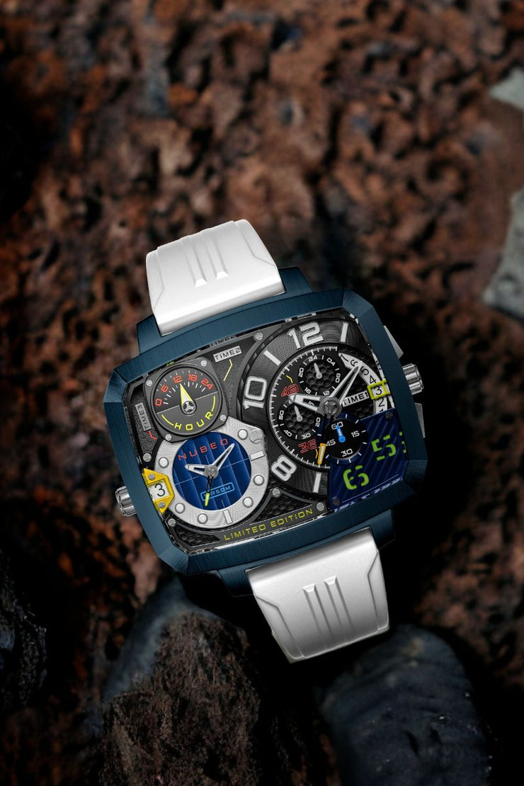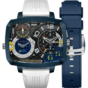 A spectacular timepiece at every angle. The Odyssey Triple Time Zone Chronograph is a limited edition of only 300 pieces. It features a unique space-inspired design and a dual time feature for travellers. Its rectangular case shape is also perfect for making a statement.