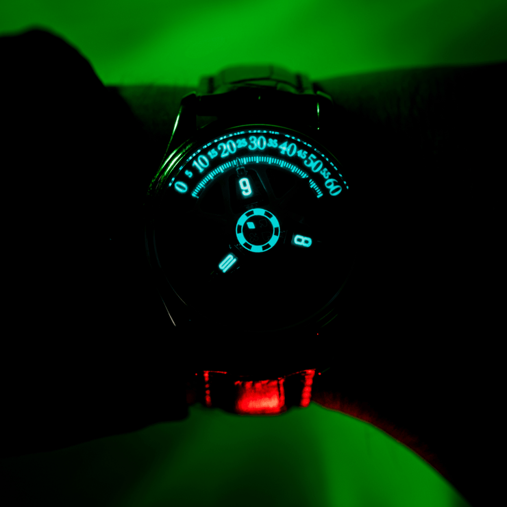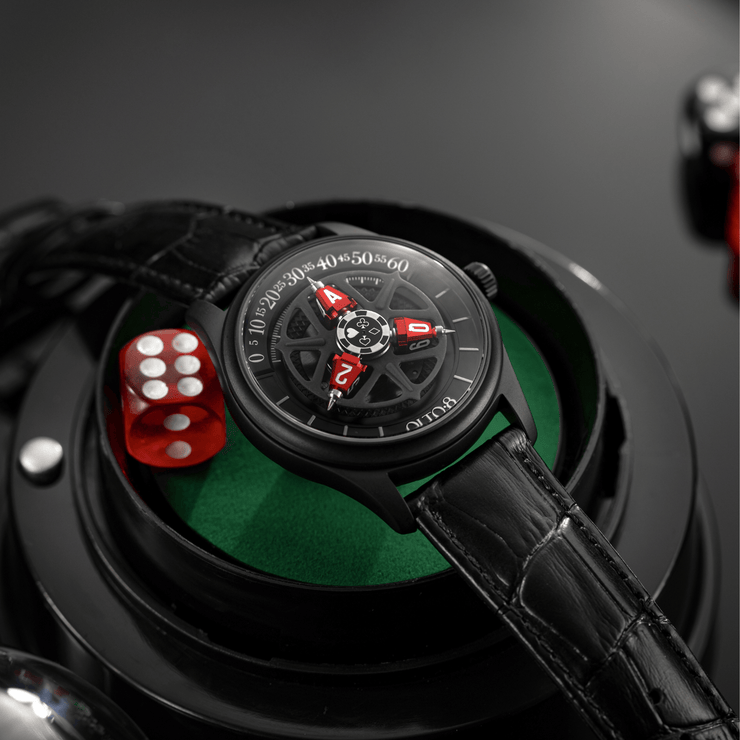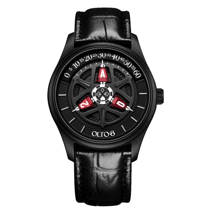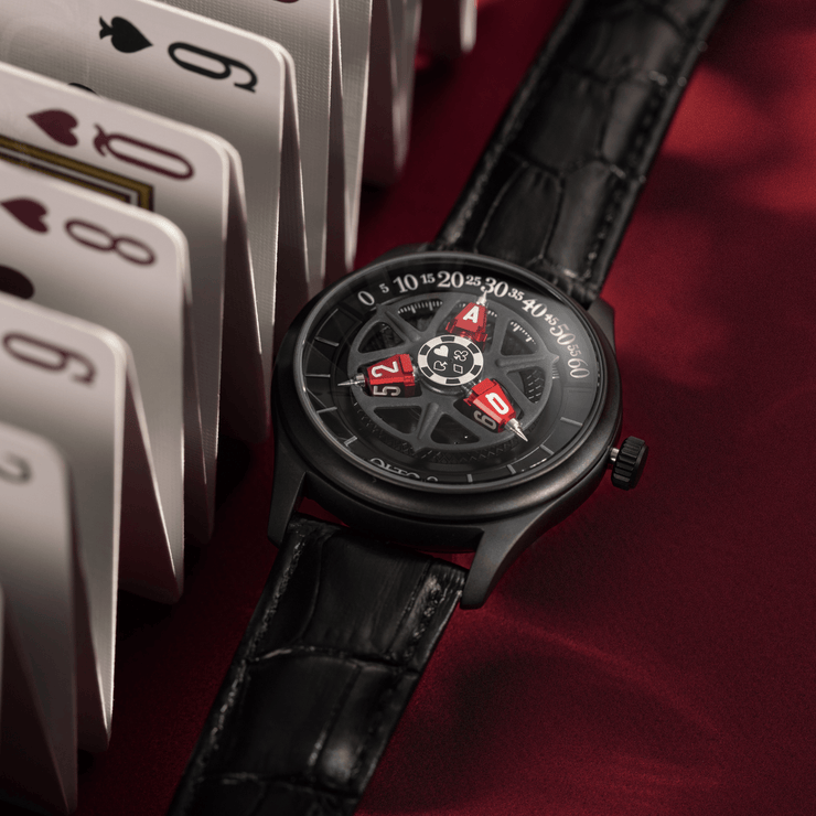 OLTO-8 KING features a multi-layered, three-dimensional copper surface process, involving oil pressure, cutting, polishing, plating, and super-luminous printing. This extensive treatment highlights its luxurious quality and exceptional craftsmanship. It also includes Swiss Super-LumiNova satellite hour wheel hands and a playing card-themed seconds disc, ensuring effortless readability at night.