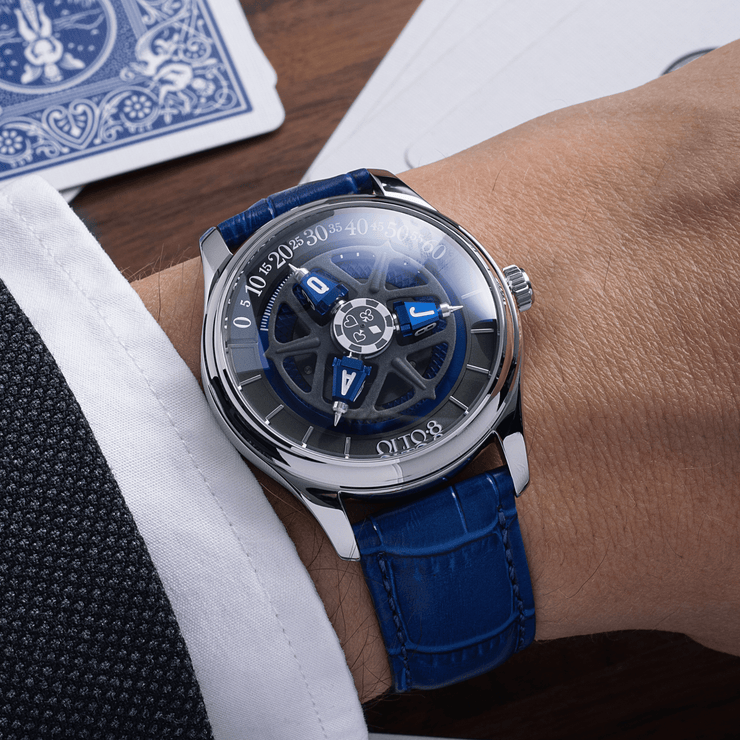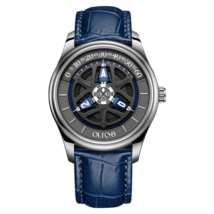 OLTO-8 KING features a multi-layered, three-dimensional copper surface process, involving oil pressure, cutting, polishing, plating, and super-luminous printing. This extensive treatment highlights its luxurious quality and exceptional craftsmanship. It also includes Swiss Super-LumiNova satellite hour wheel hands and a playing card-themed seconds disc, ensuring effortless readability at night.
