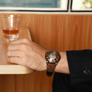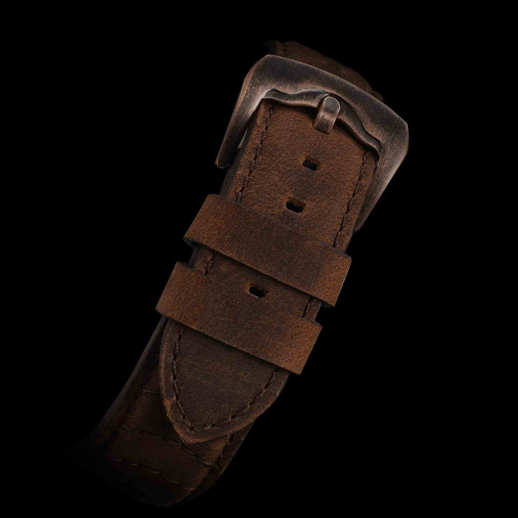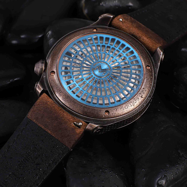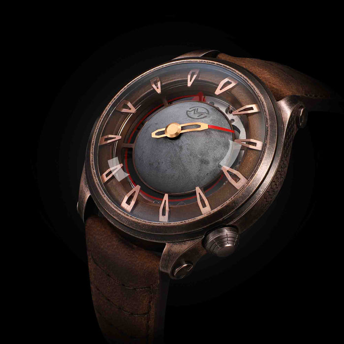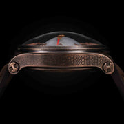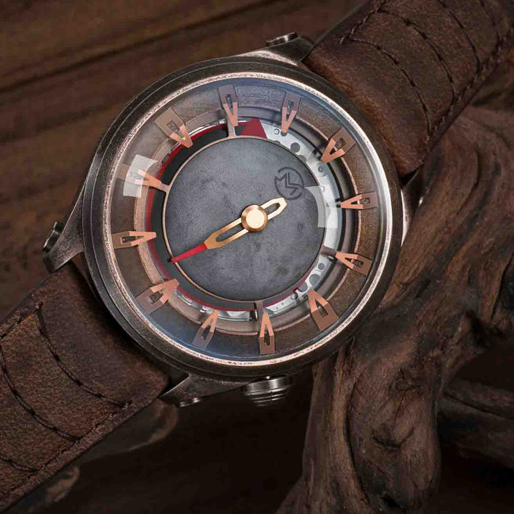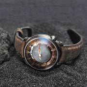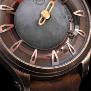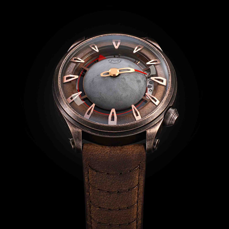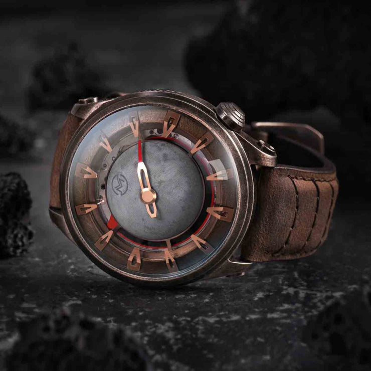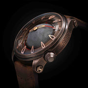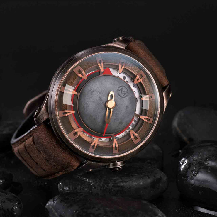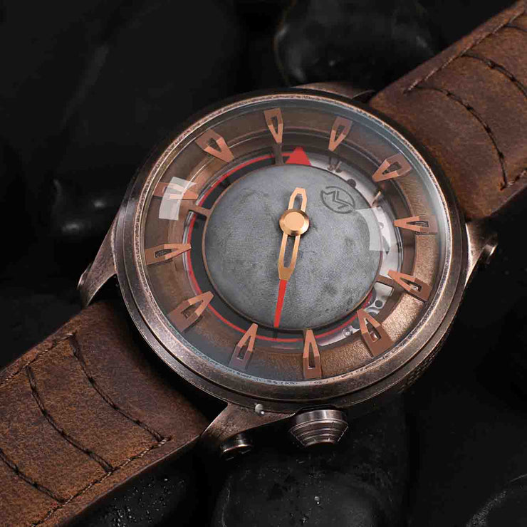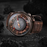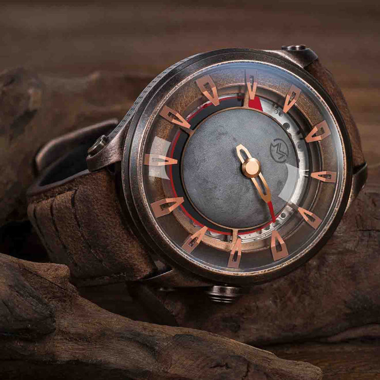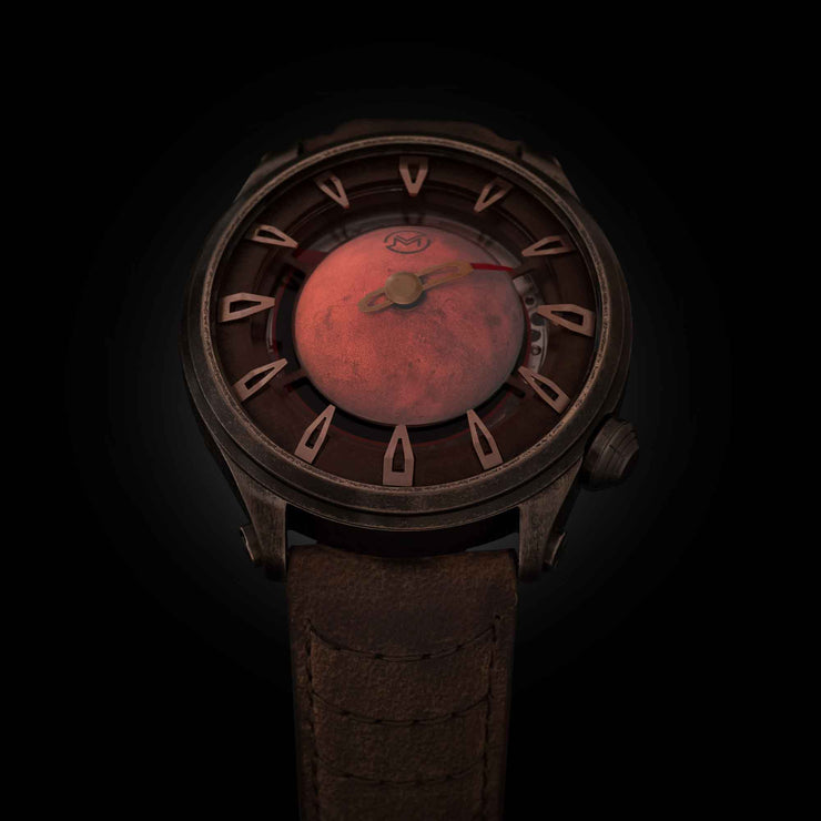 The dial is certainly the most ambitious move of Mars Mission. A 3D Mars coated with red Swiss luminescent Super-Luminova is implanted in the centre of the dial. Upon light absorption, the implanted 3D Mars glows in reddish iron in darkness. The implanted Mars is filled with aluminum, covered with embossing techniques to create a rugged surface effect. The dial is surrounded by 3D indexes to further energize the watch. Random Brush technique together with vintage effect is applied onto the dial ring to resemble the rocky appearance of Mars.