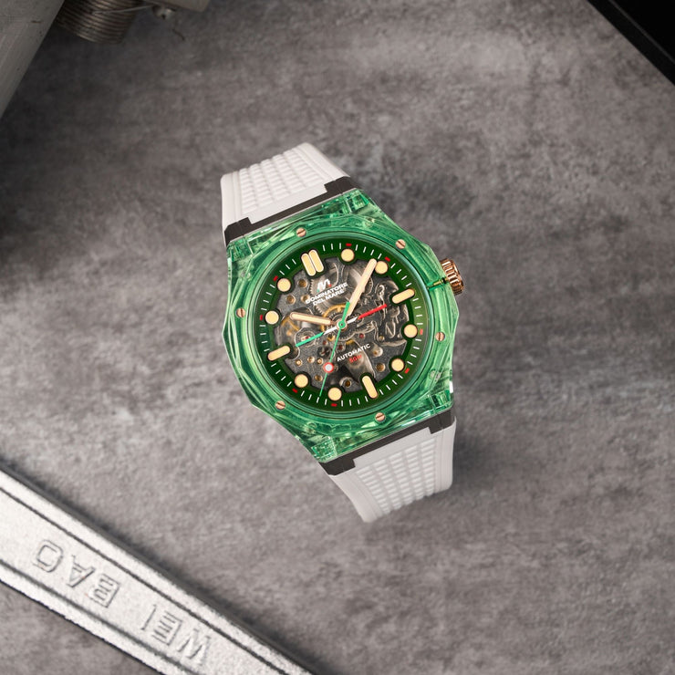 Ravello Automatic is a bold tribute to the natural beauty and vibrant spirit of Ravello, the jewel of the Amalfi Coast. Its intricate skeleton dial reveals the artistry of its automatic movement, while the semi-transparent case captures the glow of Amalfi sunsets and the vibrance of Ravello’s festivals. Like the coastal town, the Ravello Automatic marks a remarkable presence on your wrist.