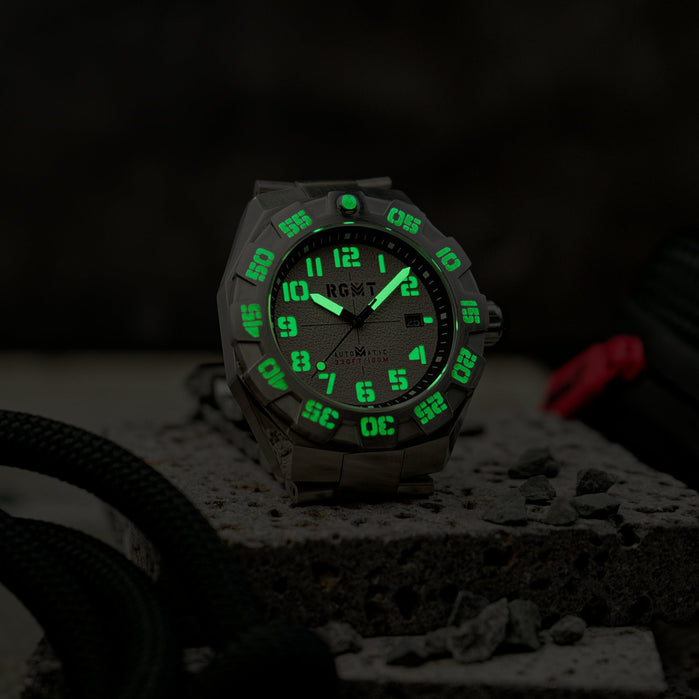 A precision Time Module Instruments TMI NH35 affords the watch a battery-free functionality that makes it the perfect timepiece for adventure on land, sea, or any environment.