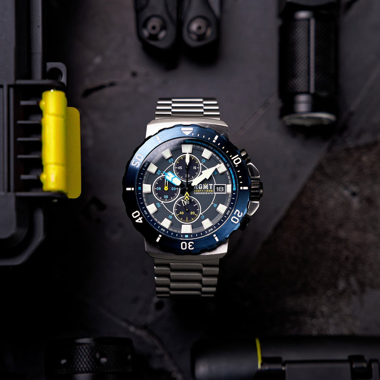 The Trench Chronograph is a captivating timepiece with a sturdy build and powerful performance. Crafted with Time Module Instruments meca-quartz movement and a unidirectional turning bezel, it is waterproof up to 10 ATM and comes with an extra silicon strap for convenience and flexible styling.