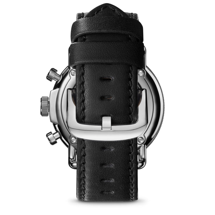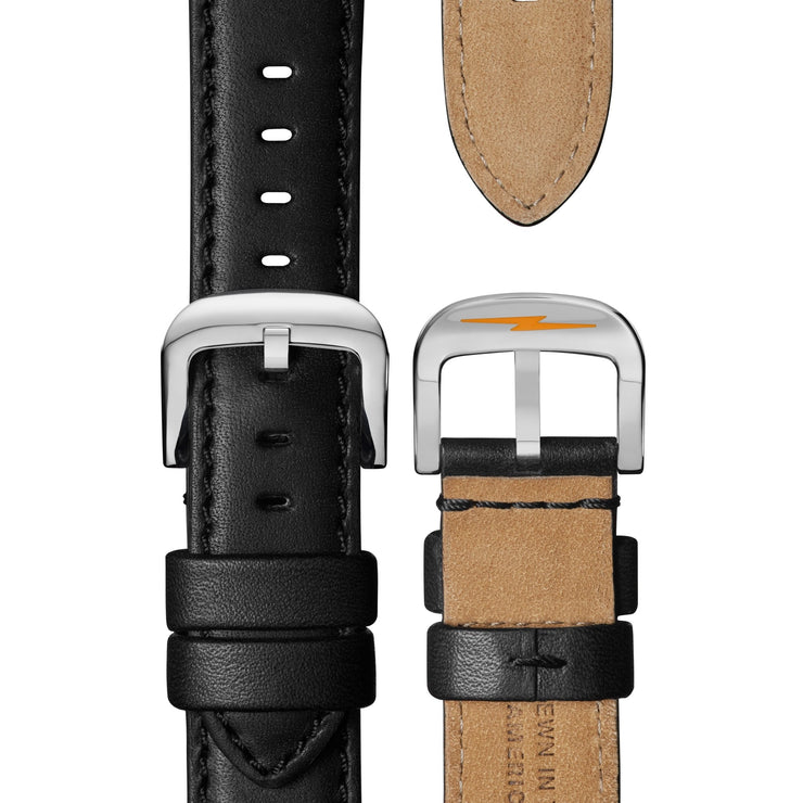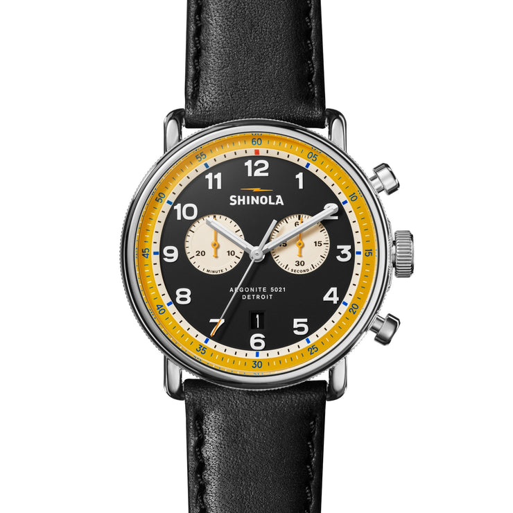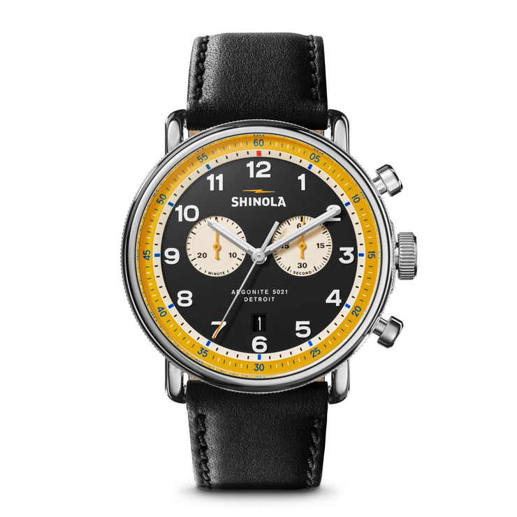 From the simplicity of the black dial to the heritage-modern fusion style of the numerals to the contrasting concave ring in canary yellow, this timepiece reveals the art in both design and in engineering. Finished with a premium leather strap in black, it’s as at home on the racetrack as it is at the office.