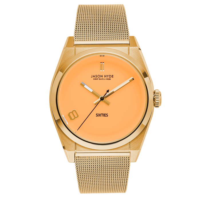 The Jason Hyde #SIXTY EIGHT 34 MM Watch offers a vibrant and modern aesthetic with a striking orange dial and a stylish yellow gold-toned mesh strap, powered by reliable Japanese movement. Featuring a slightly smaller 34mm Stainless Steel case with a durable IP Yellow Gold coating, this watch is both elegant and eye-catching. With a water resistance of 5 ATM (50 meters), it's suitable for everyday wear. This contemporary timepiece is a perfect blend of bold color and refined design.