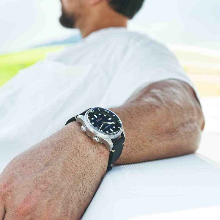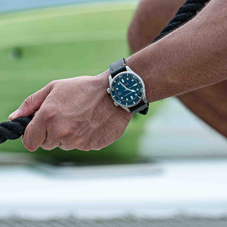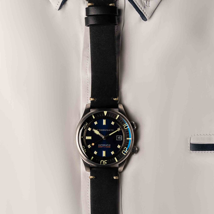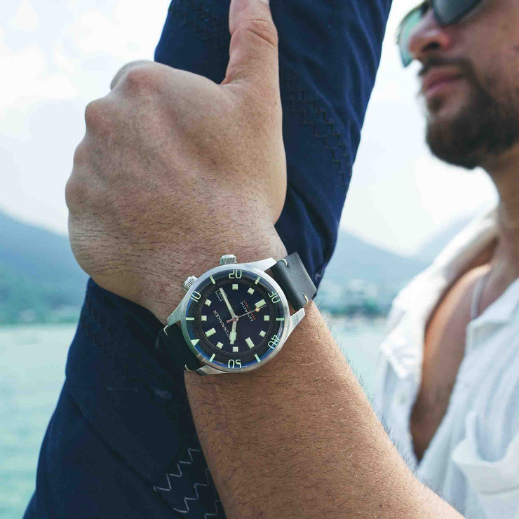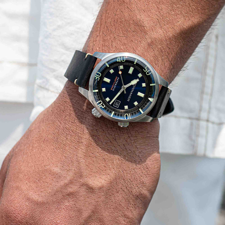 The Bradner timepiece is a vintage diver developed with a compressor case, bi-directional inner turning bezel, and liberal application of Swiss-superluminova material. It is powered by the TMI NH35 movement and has been designed and manufactured to leverage the best of modern-day watchmaking.