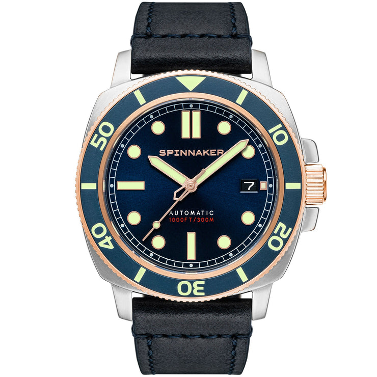With Swiss Super-Luminova throughout the dial indexes and hands, the dial is a classic diver style dial designed for visibility, legibility. A small nod to some of the vintage flair found in the Spinnaker range can be found in the railway style seconds tracks running around the hour and minute markers. The overall outcome is a pronounced diver dial that