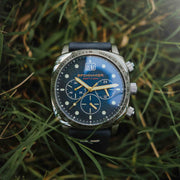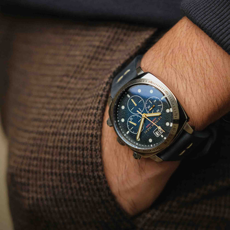 The Hull chronograph also features a grand-date dual aperture date display that is perfectly positioned to offer clarity and symmetry to the overall design and appearance of the watch.