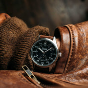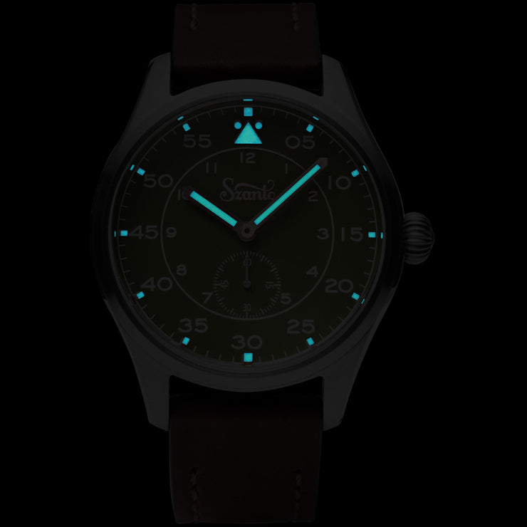 Szanto watches are a modern take on classic vintage watch designs - with classic styling and the highest quality workmanship. Szanto's modern components offer accuracy and affordability. Szanto Vintage inspired Heritage Aviator 2754 features a 41mm 316L stainless steel case, push in crown and screw down caseback, dependable and accurate Japan Quartz Small Seconds movement (Miyota 1L45), a flat hardened mineral crystal, high quality Swiss lume on the dial markings and hands for a superior and lasting glow. Calfskin leather strap with conventional signature buckle and Easy-Change Spring-bar system. Water resitant to 100 meters. Styles from the past, re-imagined for today --- take a step back in time with Szanto!