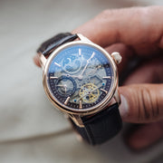 Drawing inspiration from the lines of Longitude, once the most crucial tool in navigating the seas, a large, classically formed case exhibits a complex yet precise piece of timekeeping mastery.