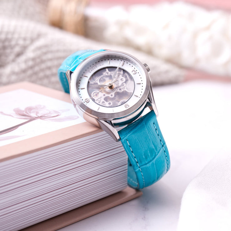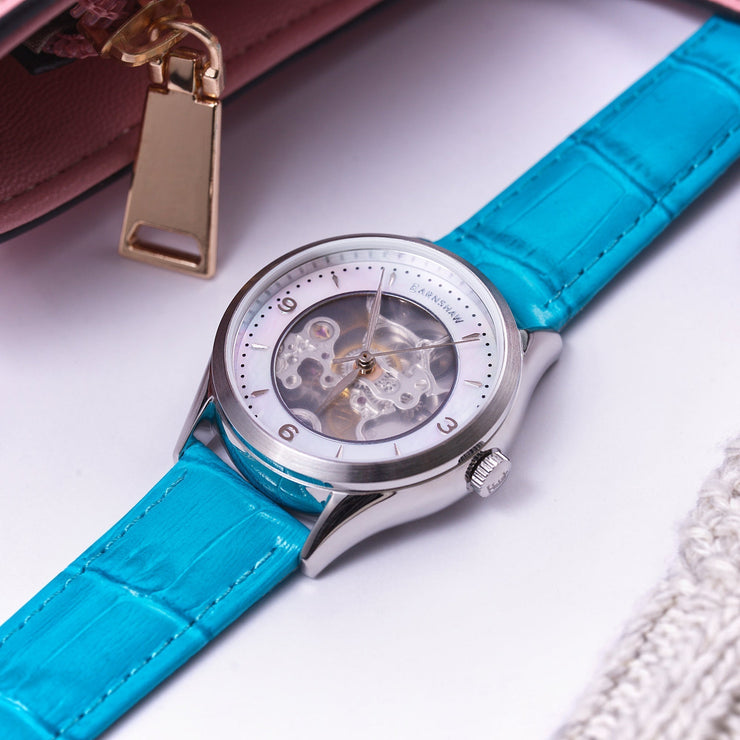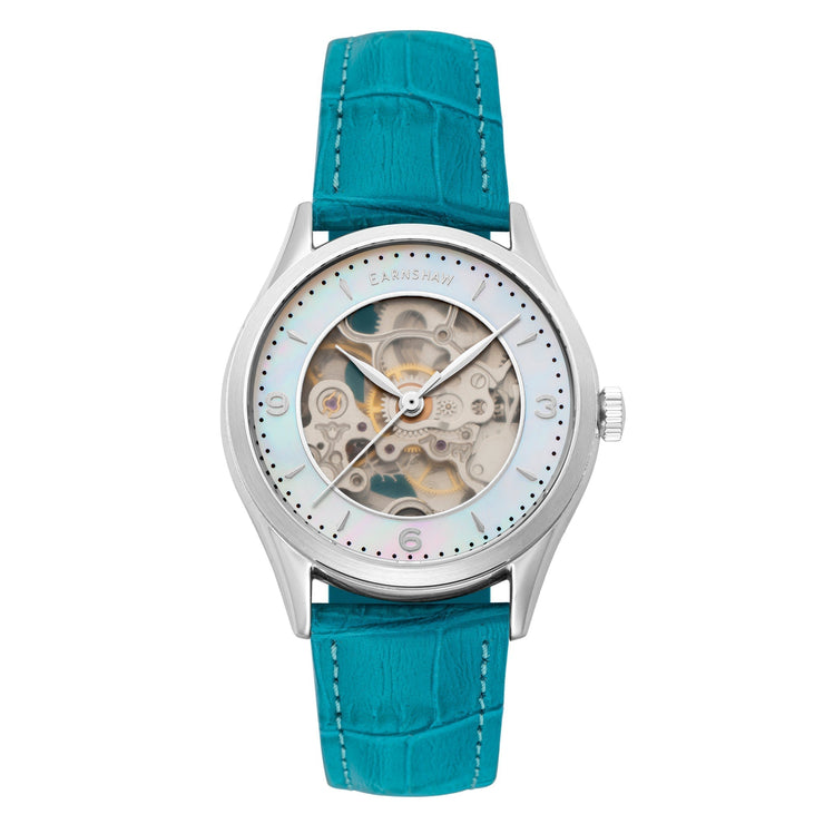 The legacy of Earnshaw comes alive in a watch designed for a woman of substance. A skeleton automatic visible through the lens with a genuine mother of pearl dial makes for a watch of elegance, stature, and luxury.