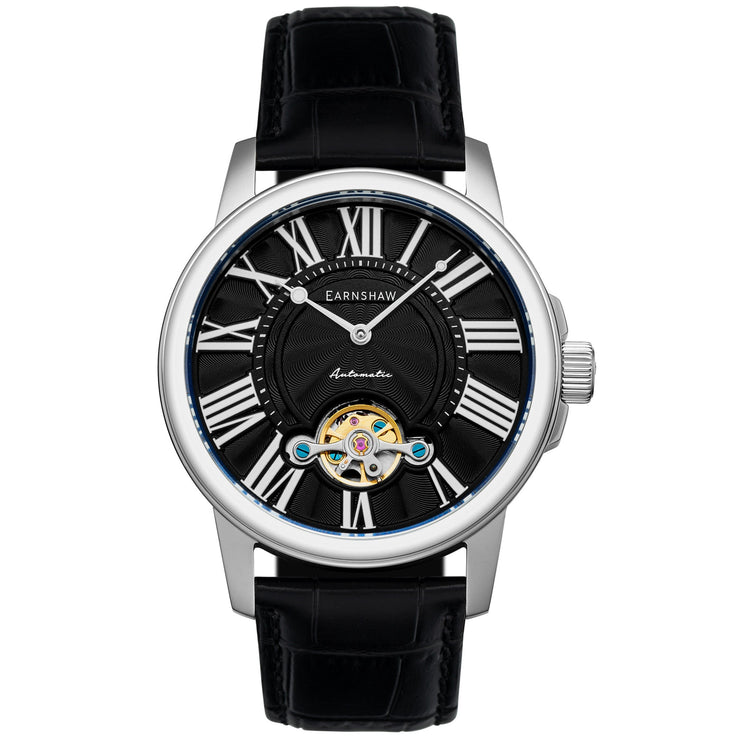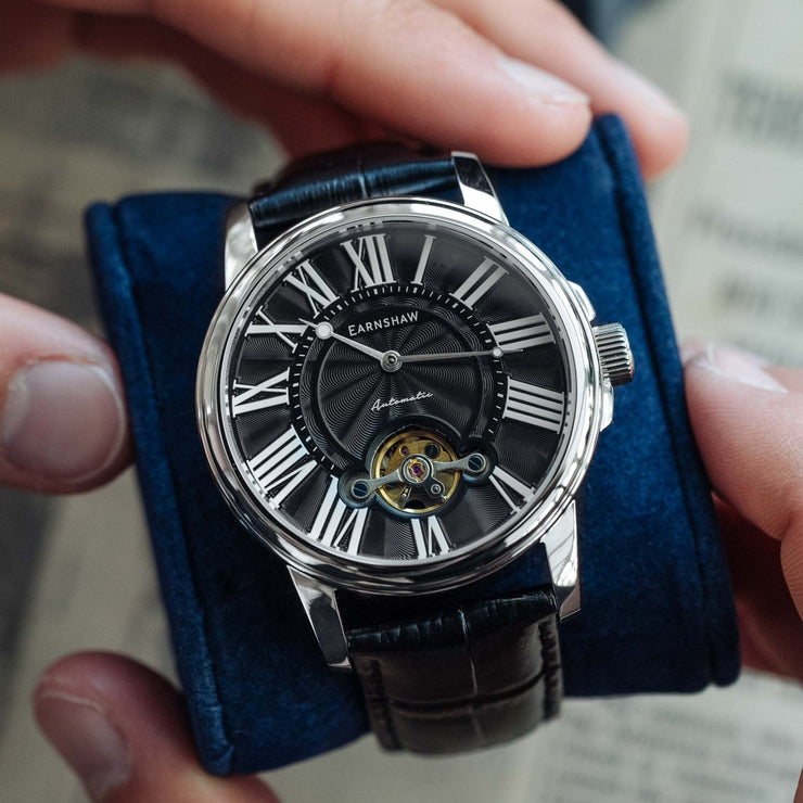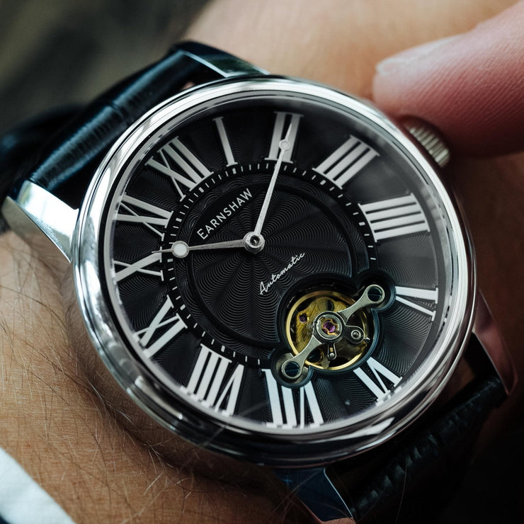 A stunning dial with roman numeral indexes framing a cutaway display exposing the flywheel of the movement for a classic, stylish timepiece for all seasons.