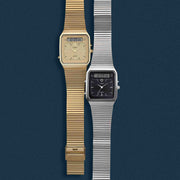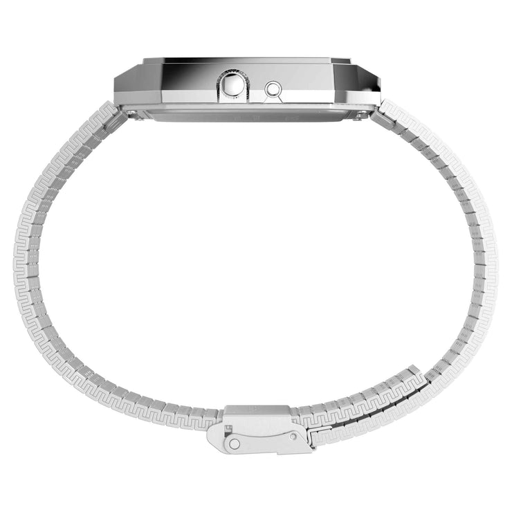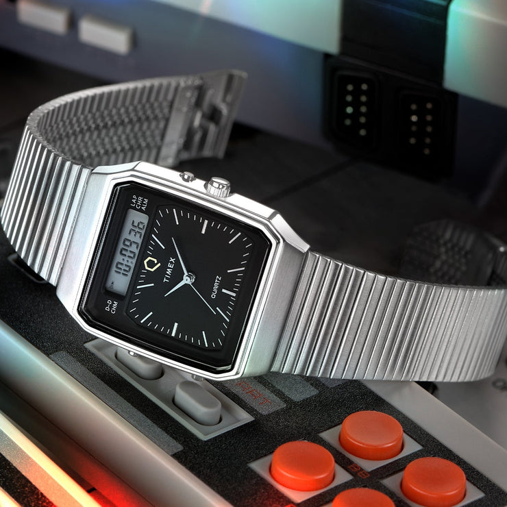 A Dynamic Fusion of Tradition and Innovation. This modern-day reissue of an ‘80s classic delivers quartz accuracy with a dual analog and digital display on a clean black dial. Upgraded with a modestly sized 33mm brushed and polished stainless-steel case, it’s packed with the features you need to keep you on schedule and get you through the work week: dual time zone tracking, a chronograph, alarm, and date function. Finished with a thin handset, a polished crown and pushers, a brushed silver-tone stainless-steel bracelet, and the distinct Q Timex® logo authentic to the original, this ana-digi dress watch is a true throwback.
