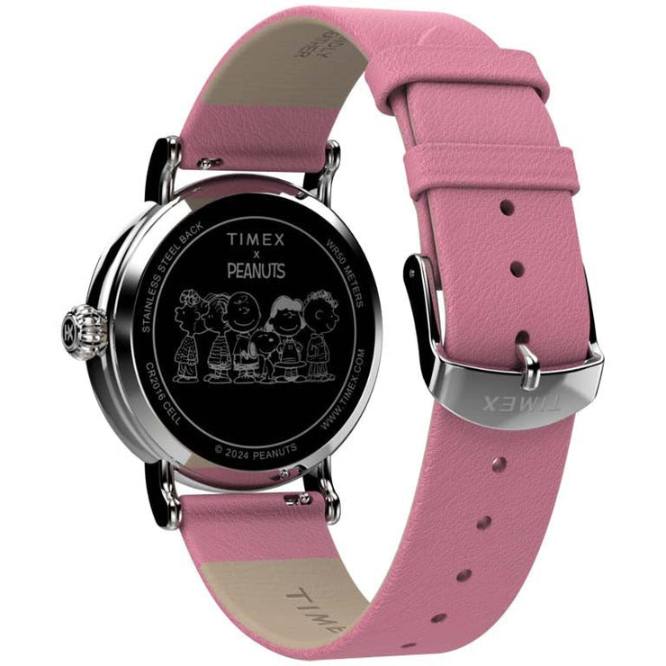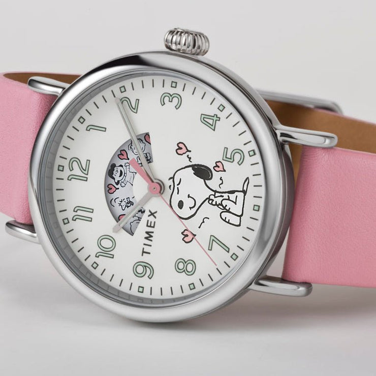 Snoopy graces the dial of the Timex Standard, adding a playful touch to this timeless piece. Housed in a 40mm polished silver-tone case, the dial features a special revolving window below 12 o’clock that showcases the Peanuts gang. They’ve paired it with a two-piece pink leather strap featuring quick-release spring bars, luminous hands, and a vintage-style onion crown, bringing classic elegance to your wrist during the season of love and beyond!