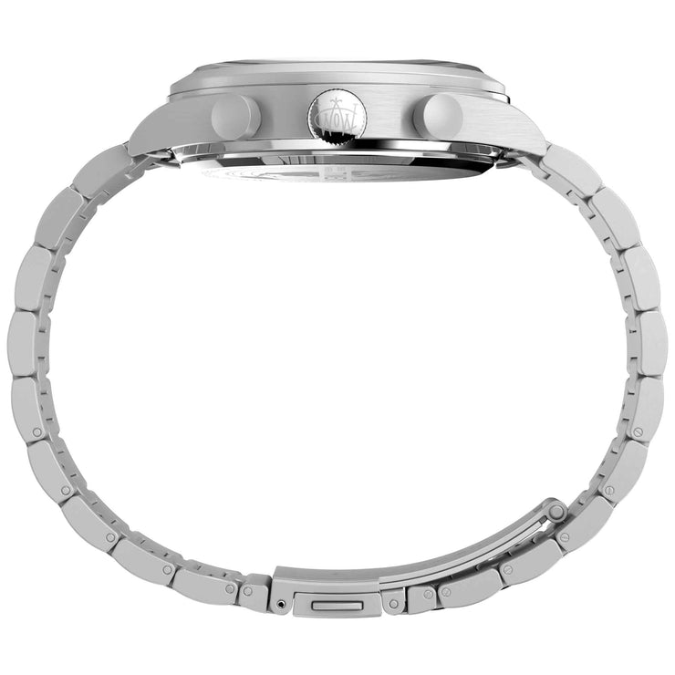 Built with their proprietary fly back chronograph movement designed in Pforzheim, Germany, the dial of the Waterbury Traditional Fly Back Chronograph houses fan-shaped sub-dials at the 4 o'clock and 10 o'clock positions with retrograde hands. A single press of the fly back pusher instantly resets the chronograph to display the current time in the current lap without the need to stop and reset, and when the chronograph isn’t in use, the upper sub-dial doubles as a second time zone indicator. This watch boasts a robust 43mm stainless-steel case paired with an adjustable stainless-steel bracelet. Other notable details include a date window positioned at 2:30, luminous hour and minute hands for enhanced visibility, 100m of water resistance, and the iconic stylized W of the Waterbury Watch Company logo displayed on the crown, sweep second hand, and beside the 7th hour marker.