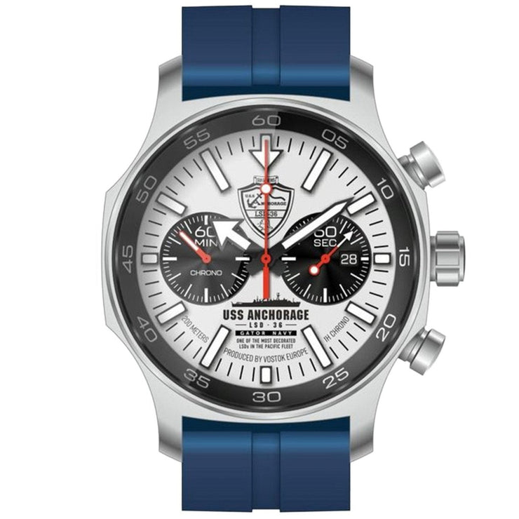 The Vostok-Europe USS Anchorage 47mm Chronograph is a testament to precision, heritage, and craftsmanship. Meticulously handcrafted in Lithuania, this wrist marvel stands as a symbol of dedication, honoring the USS Anchorage – one of the most decorated Landing Ship Docks in the Pacific fleet.