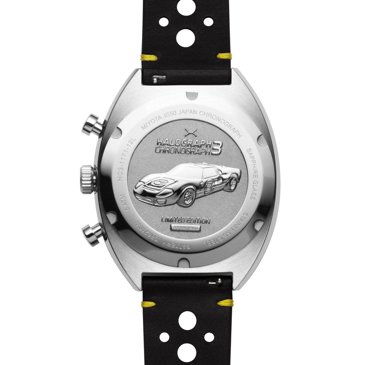 We took our favorite parts of the Halograph and upgraded them with a retro-automotive twist. Bold colors and a sleek new case design take the Halograph in a direction it has never gone before. The Halograph III Chrono runs on a precise Miyota movement with a linear chronograph displayed at the bottom, like the gauges on the dash of a race car.