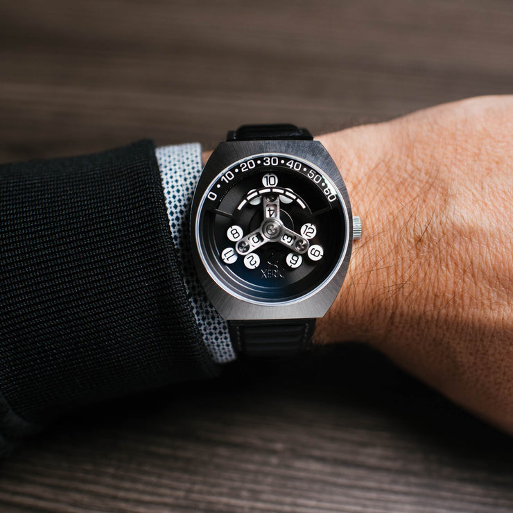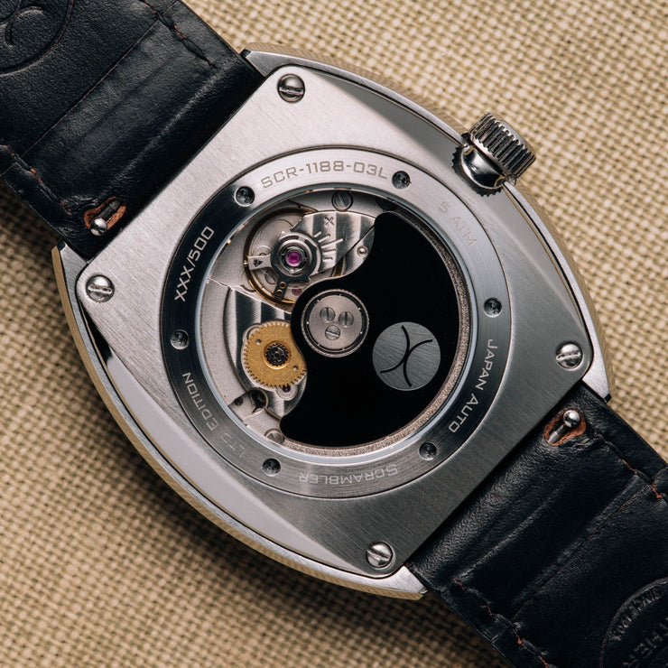 The Scrambler Automatic takes design cues from vintage 1970s watch cases, while taking advantage of modern manufacturing and finishing precision today. Powered by our proprietary automatic wandering hour movement, it’s completely mechanical. It never requires batteries and will never die as you wear it.