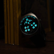 We used the best materials to create the Scrambler Automatic – a beautifully brushed case made of 316L stainless steel, colorful anodized aluminum module arms, ribbed American Horween leather straps, and Swiss-made Super-LumiNova minutes and hours. With all of the lume on the Scrambler back-filled in deep wells, this is the brightest Xeric watch to date.