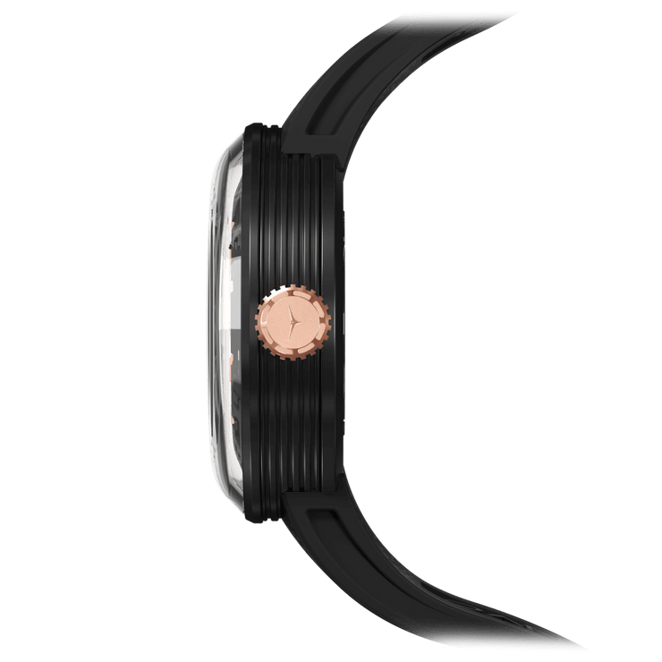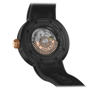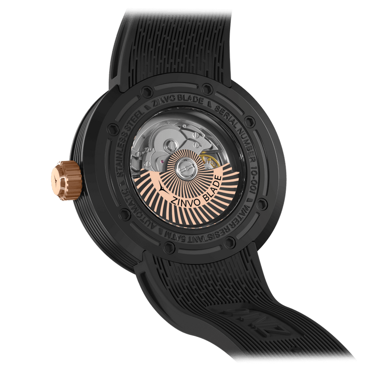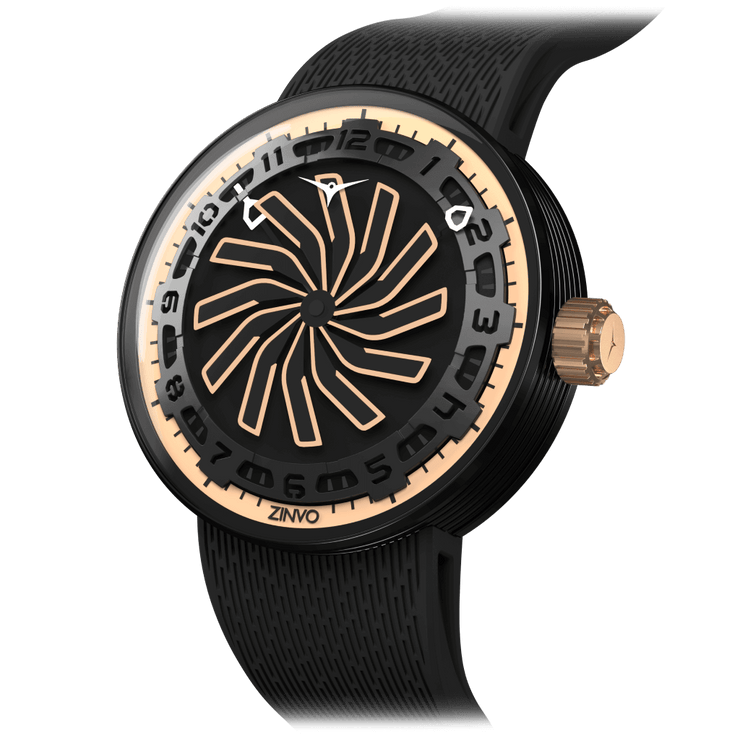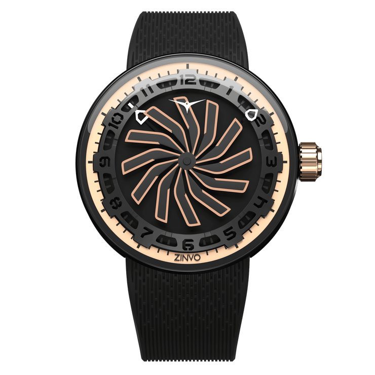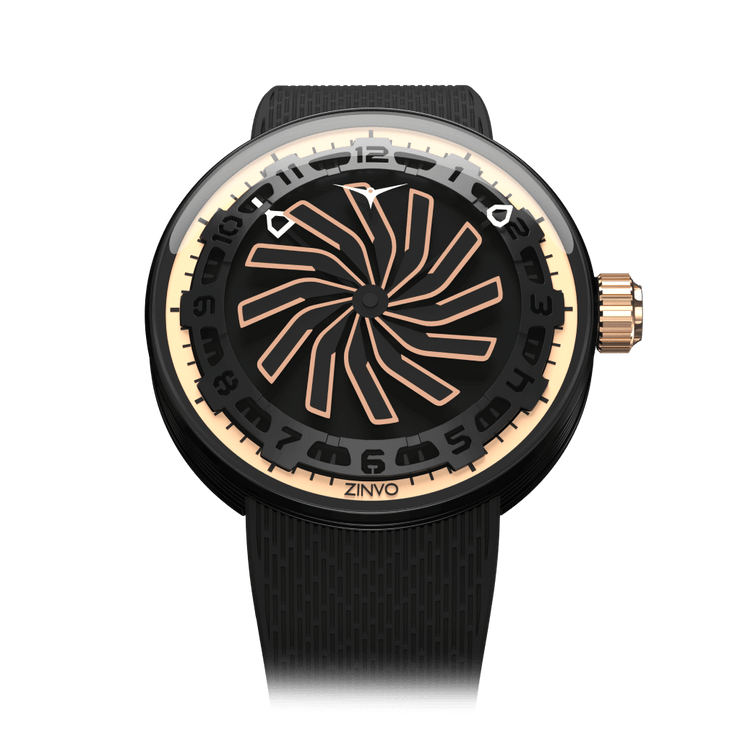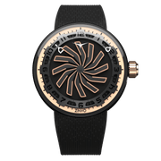 The combination of rose gold and black speaks for itself. This mens watch is a conversation starter. Blade Spirit features our signature 1-second spin turbine dial.