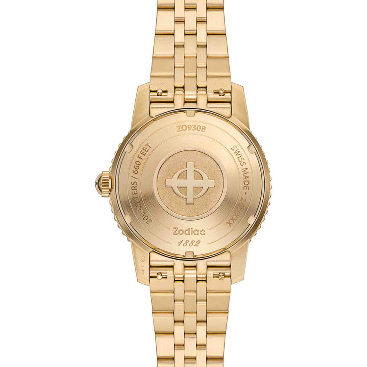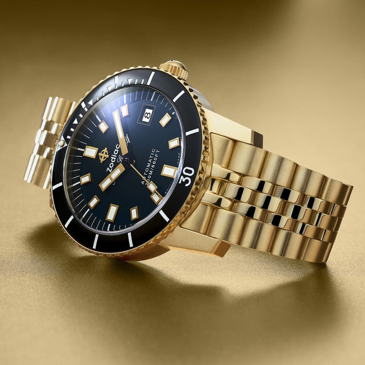 Zodiac's 40mm Compression Diver watch features a blue glossy dial, STP 1-21 automatic movement and a 18K gold-plated case and bracelet. Limited to only 300 pieces
